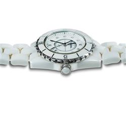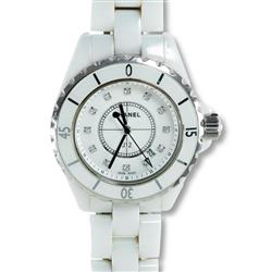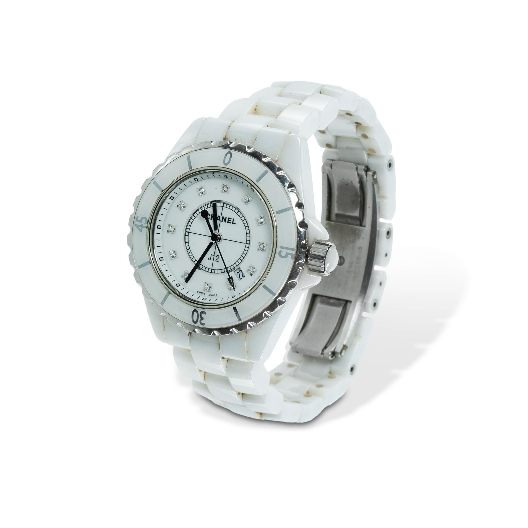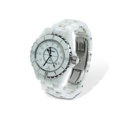 Chanel J12 Automatique Ceramic Watch White ceramic case and band with diamond hour markers, sweep seconds, date and rotating bezel.Estimate $2,750-4,750