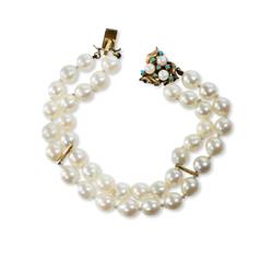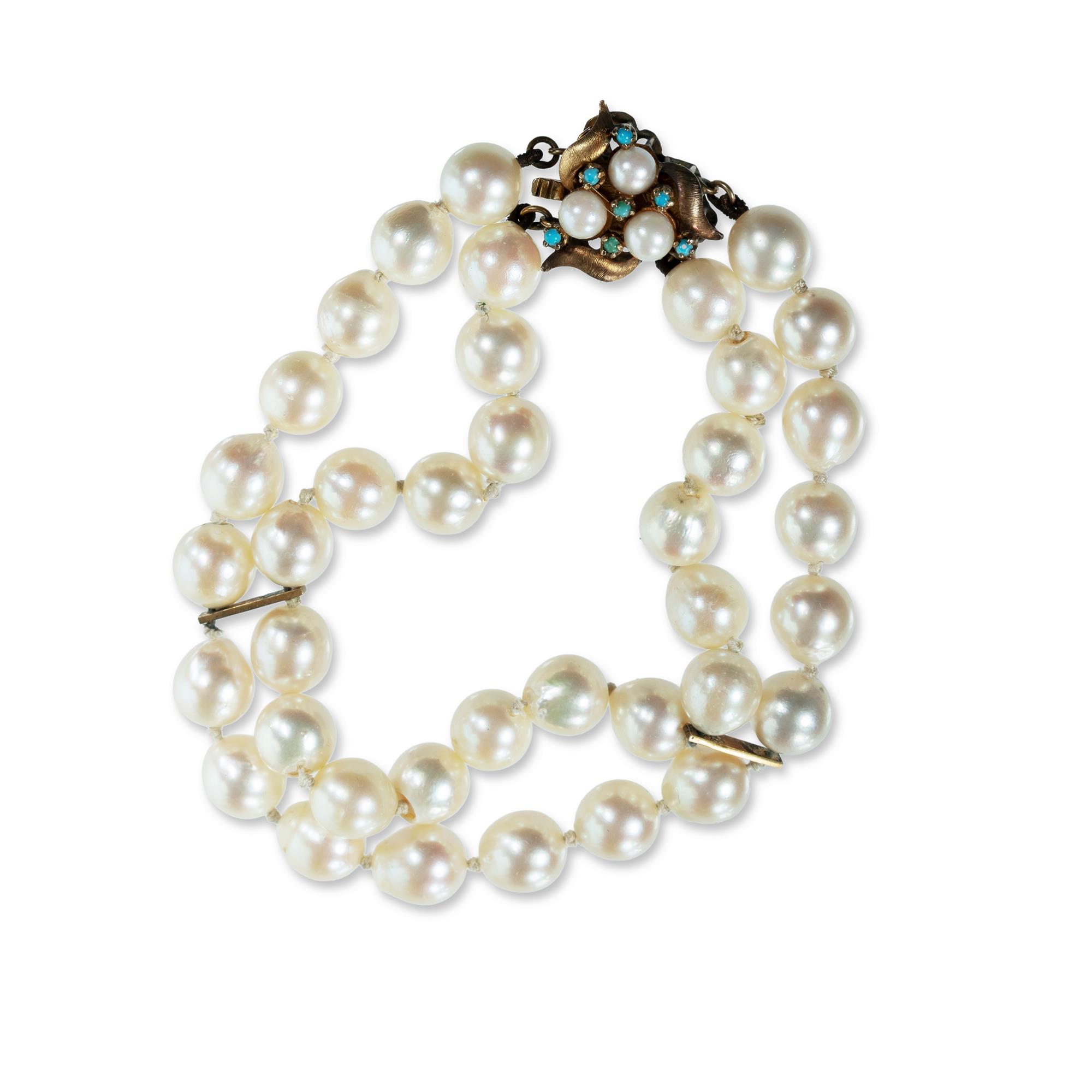 Double Strand Pearl Bracelet Thirty eight semi baroque cultured pearl 2 strand pearl bracelet. Approx. 8mm pearls with 14ct three pearl and seven turquoise set clasp, and two spacer bars. (L21cm)Estimate $200-400