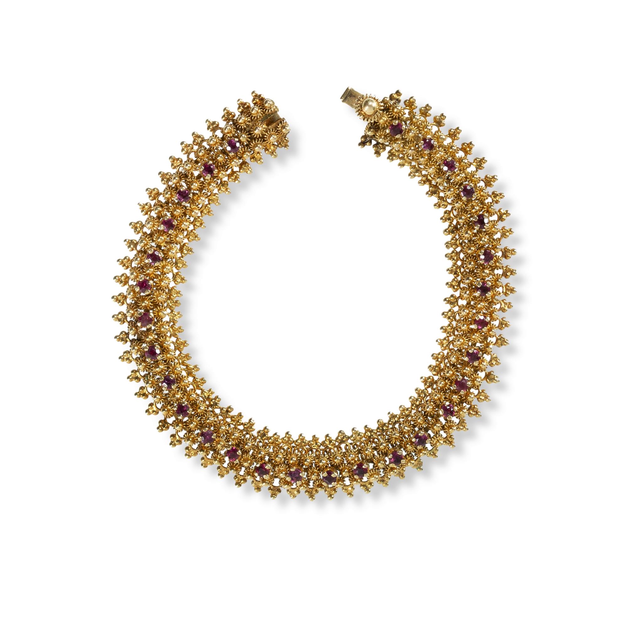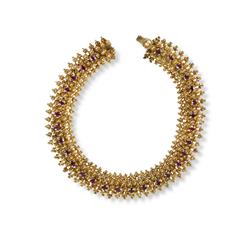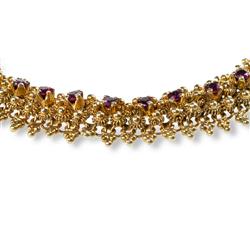 12ct Yellow Gold & Ruby Bracelet Twenty nine rubies total approx. 2.5ct. Marked 12K tests 12K (L18cm W23.57g)Estimate $700-1,200