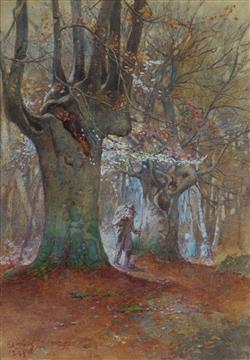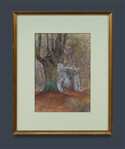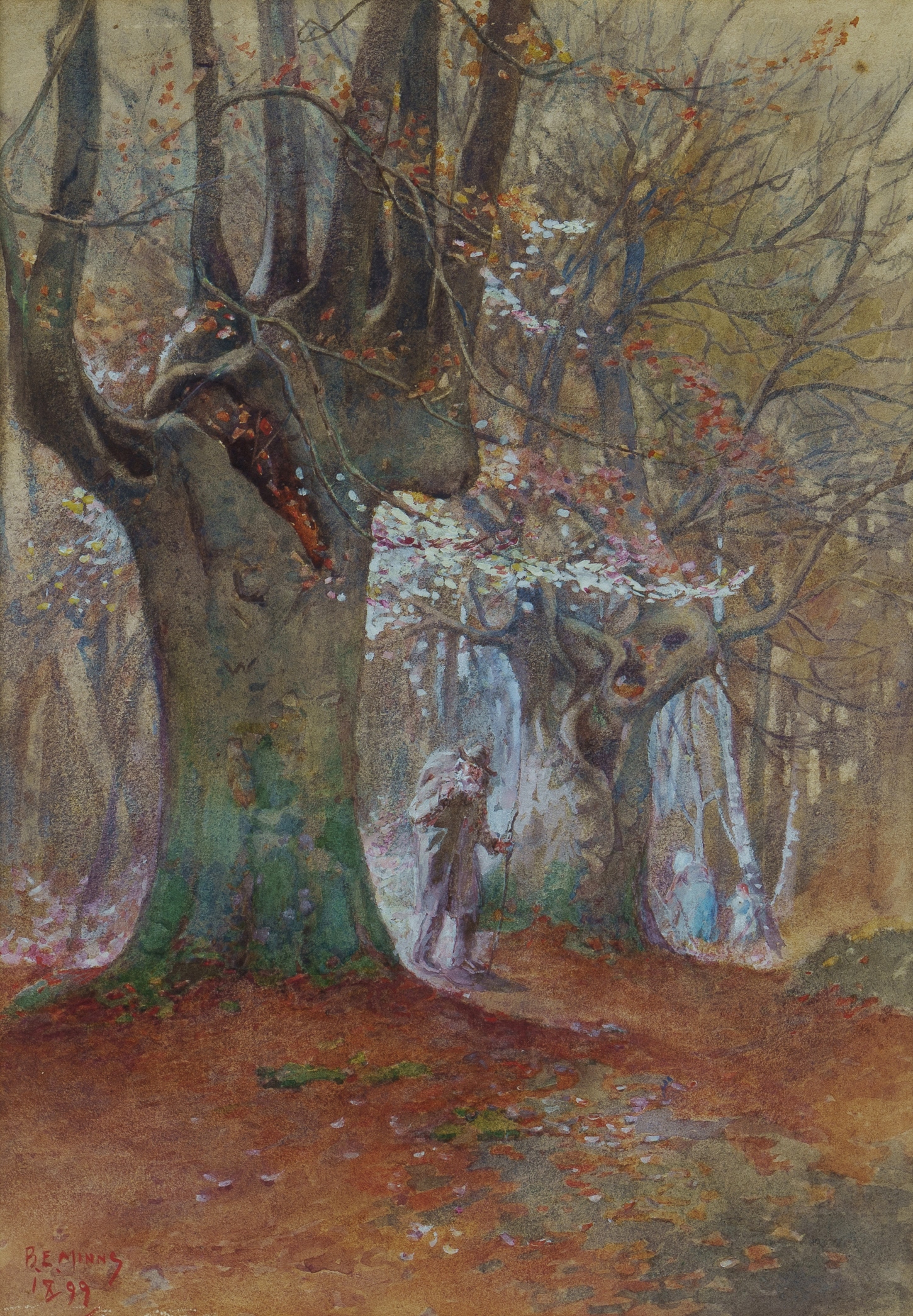 MINNS, Benjamin E (1864-1937) Figures in Forest, 1899. Signed lower left. W/Clr 34x24cm PROVENANCE: The Fred and Elinor Wrobel Collection, Sydney; Estate Late Elinor Wrobel.Estimate $300-500