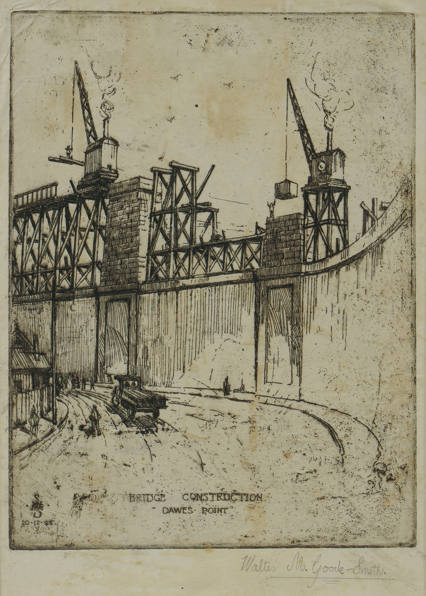 GOODE-SMITH, Walter M. (1875-1903) 'Bridge Construction - Dawes Point,' 1926. Signed lower right. Etching 20x15cm (plate) PROVENANCE: The Fred and Elinor Wrobel Collection, Sydney; Estate Late Elinor Wrobel.Estimate $100-200