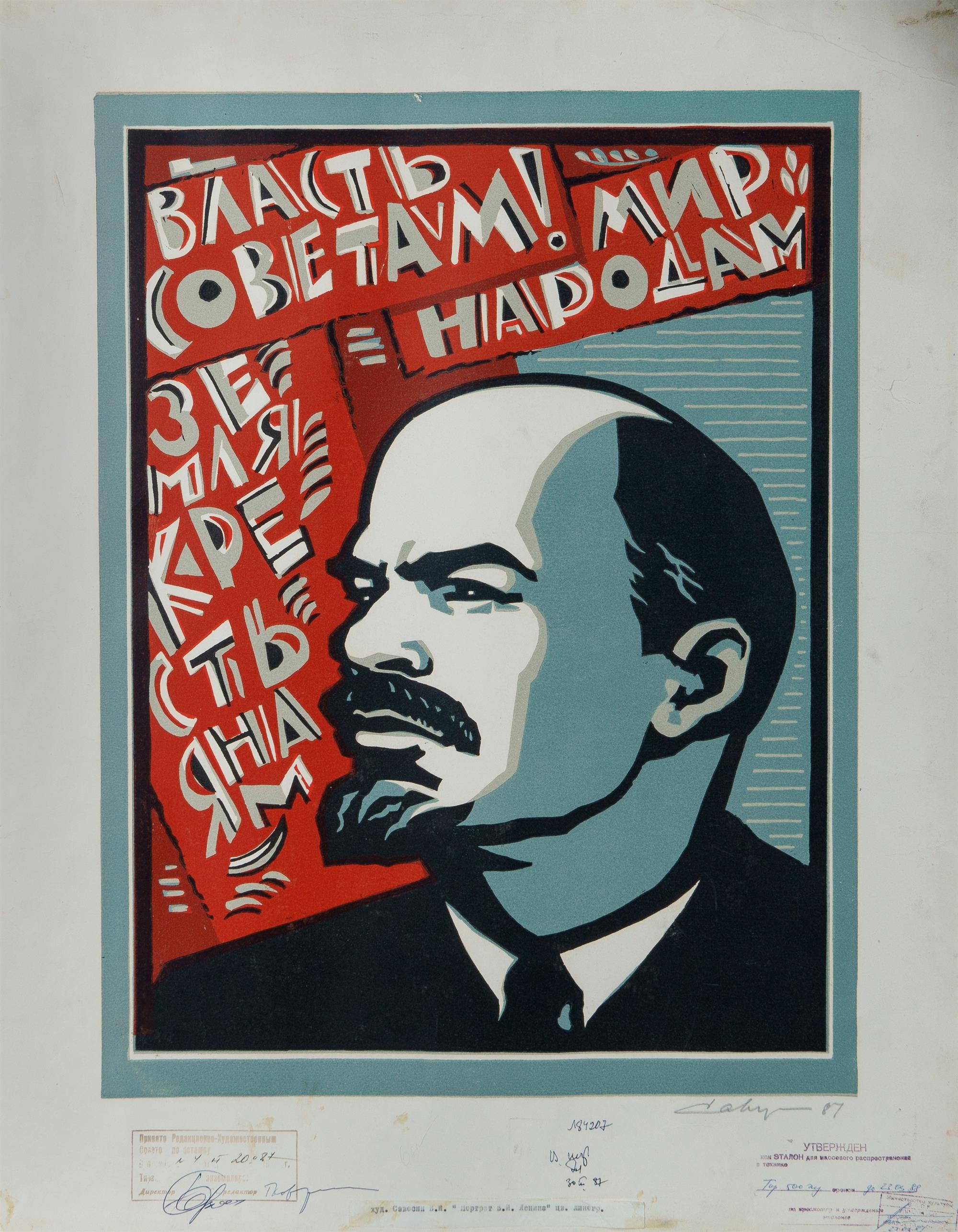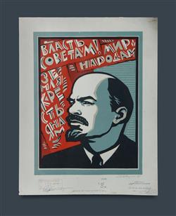 SAVOSIN, V.I. (Russian b.1938) 'Lenin - All Power to the Soviets,' 1987. Russian propaganda poster. Signed lower right. Various inscriptions and stamps to lower margin and verso. Linocut 72x56cmEstimate $80-150