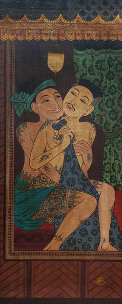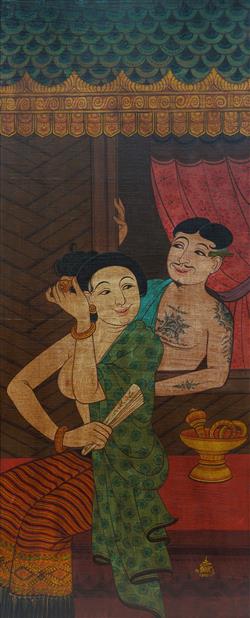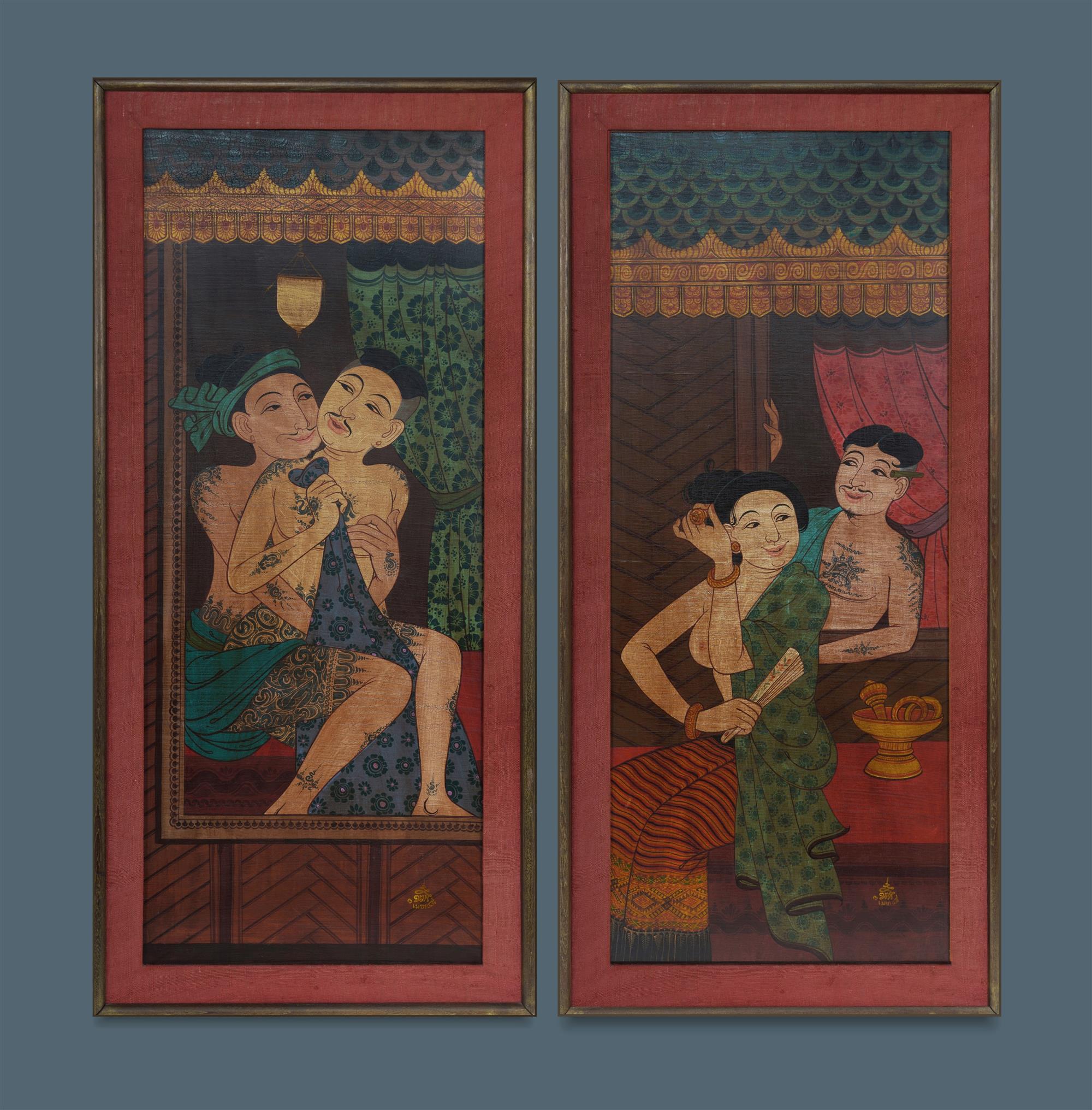 Artist Unknown, (Thai School) (2) Amorous Couples, c.1980s. Oil on Ply (2) 118x48cm (each)Estimate $350-450