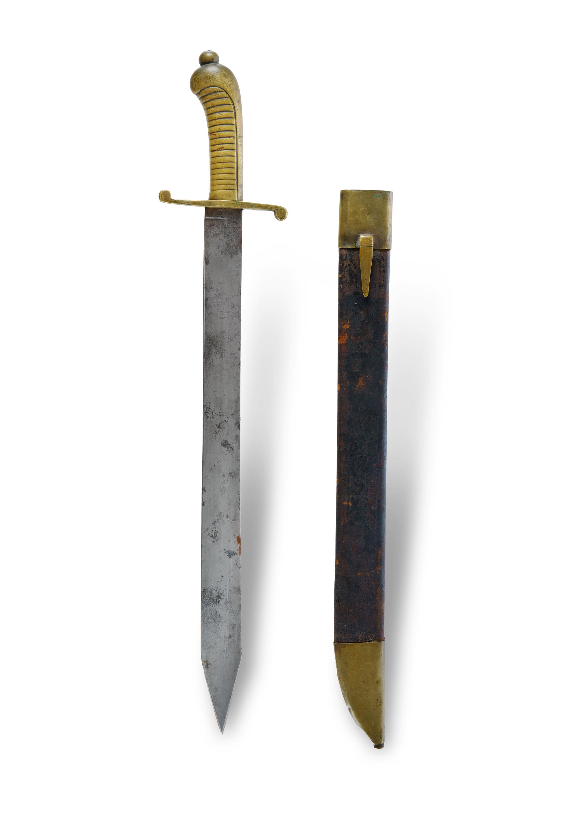 Saxon Model 1840 'Faschinenmesser' Short Sword Weyersberg Kirschbaum & Co. Solingen. Cast brass hilt. Tip reworked into spearpoint. L62.5cm (in scabbard)Estimate $250-450