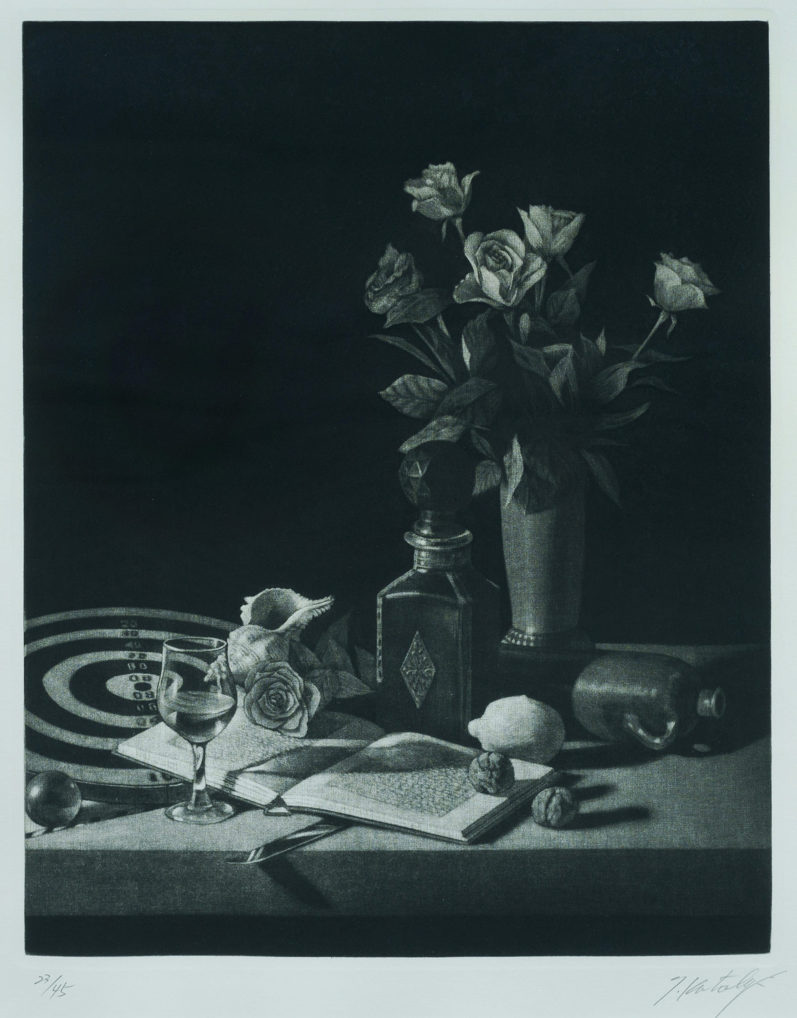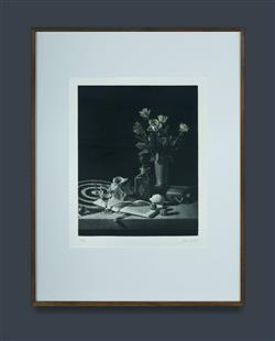 KATORI, Takeshi (Japanese b.1949) Roses, book and wine still life Signed in pencil lower right. Mezzotint 23/45 33.5x27cm (image)Estimate $100-200