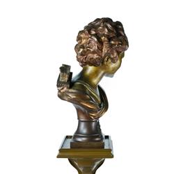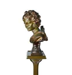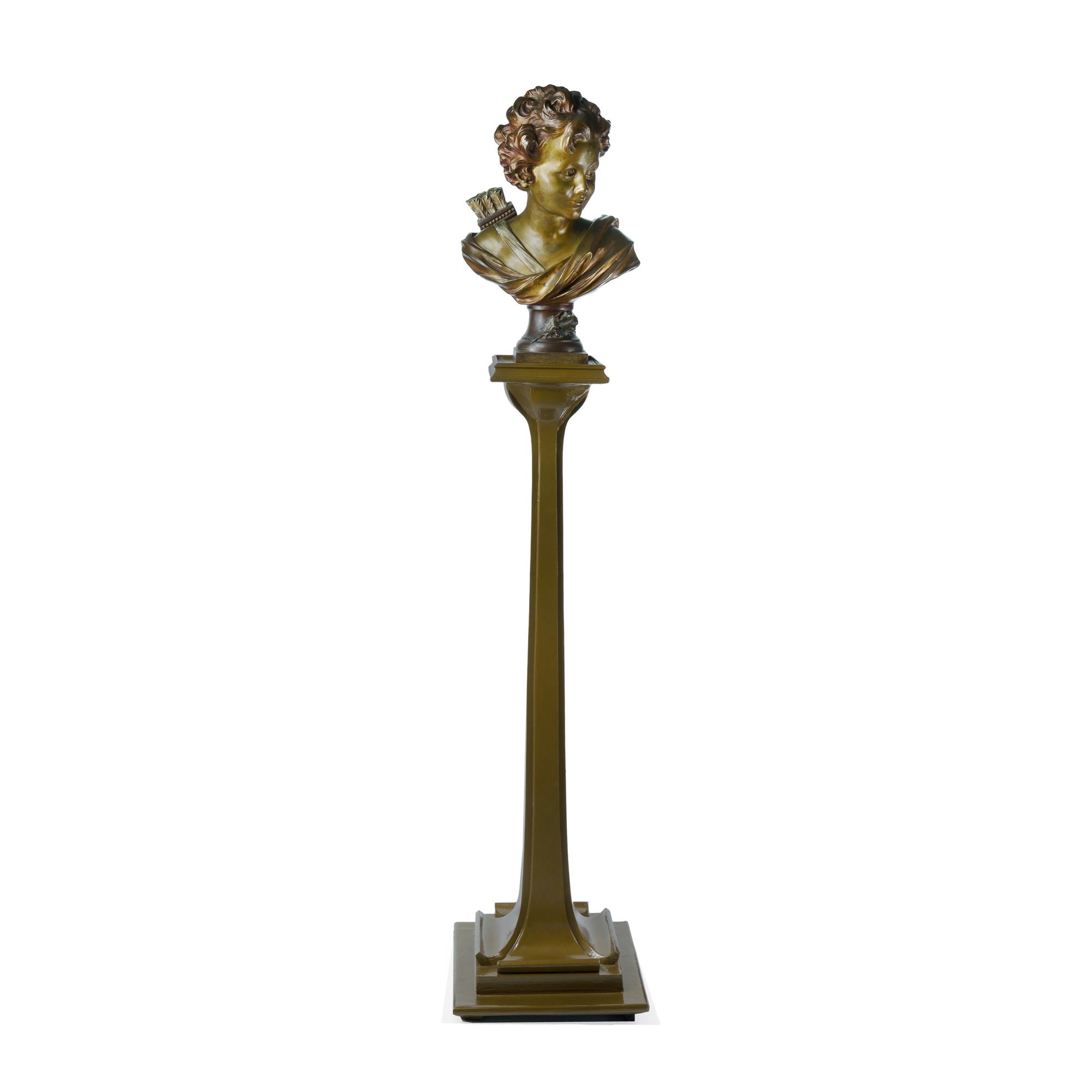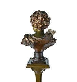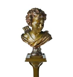 Agathon LEONARD, (French 1841-1923) Bronze Bust of Cupid on an Art Nouveau Column With a gilt finish. Cast signature 'Leonard', foundry mark for LN Paris JL (Les Neveux de Jules Lehmann) H52cm (bust) H130cm (stand)Estimate $800-1,200