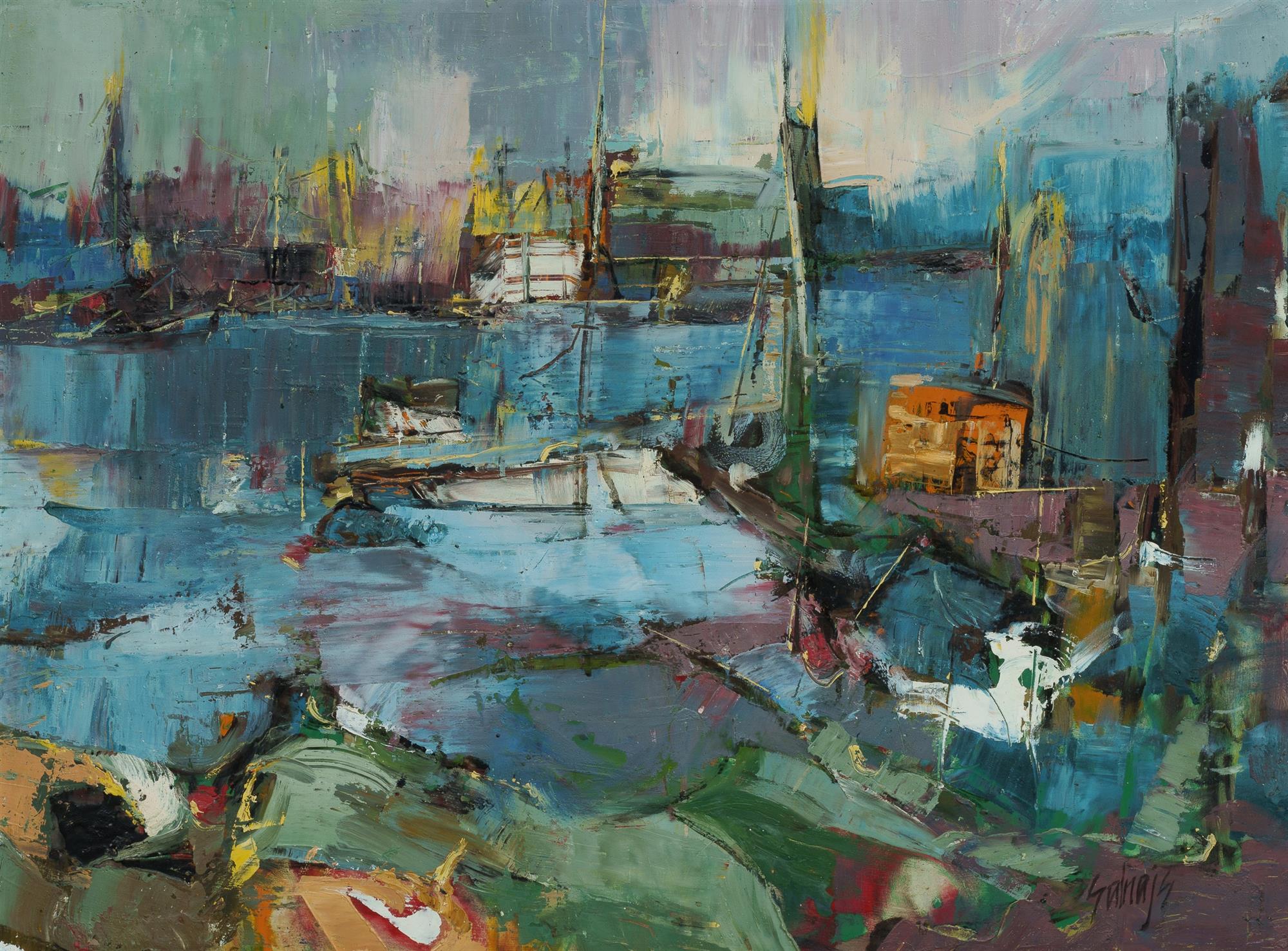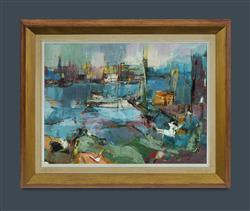 SALNAJS, Venita (b.1945) 'Waterfront I' Signed lower right. Oil on Board 44x59.5cm PROVENANCE: The Fred and Elinor Wrobel Collection, Sydney; Estate Late Elinor Wrobel.Estimate $150-250