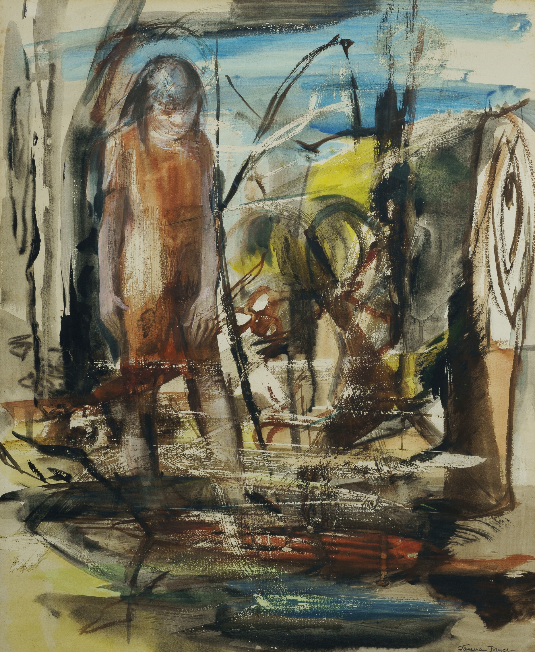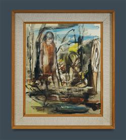 BRUCE, Alice Joyce (Janna) (b.1909-?) 'Girls by a Waterhole' Signed lower right; artist label verso. W/Clr & Ink 60x50cm PROVENANCE: The Fred and Elinor Wrobel Collection, Sydney; Estate Late Elinor Wrobel.Estimate $150-250