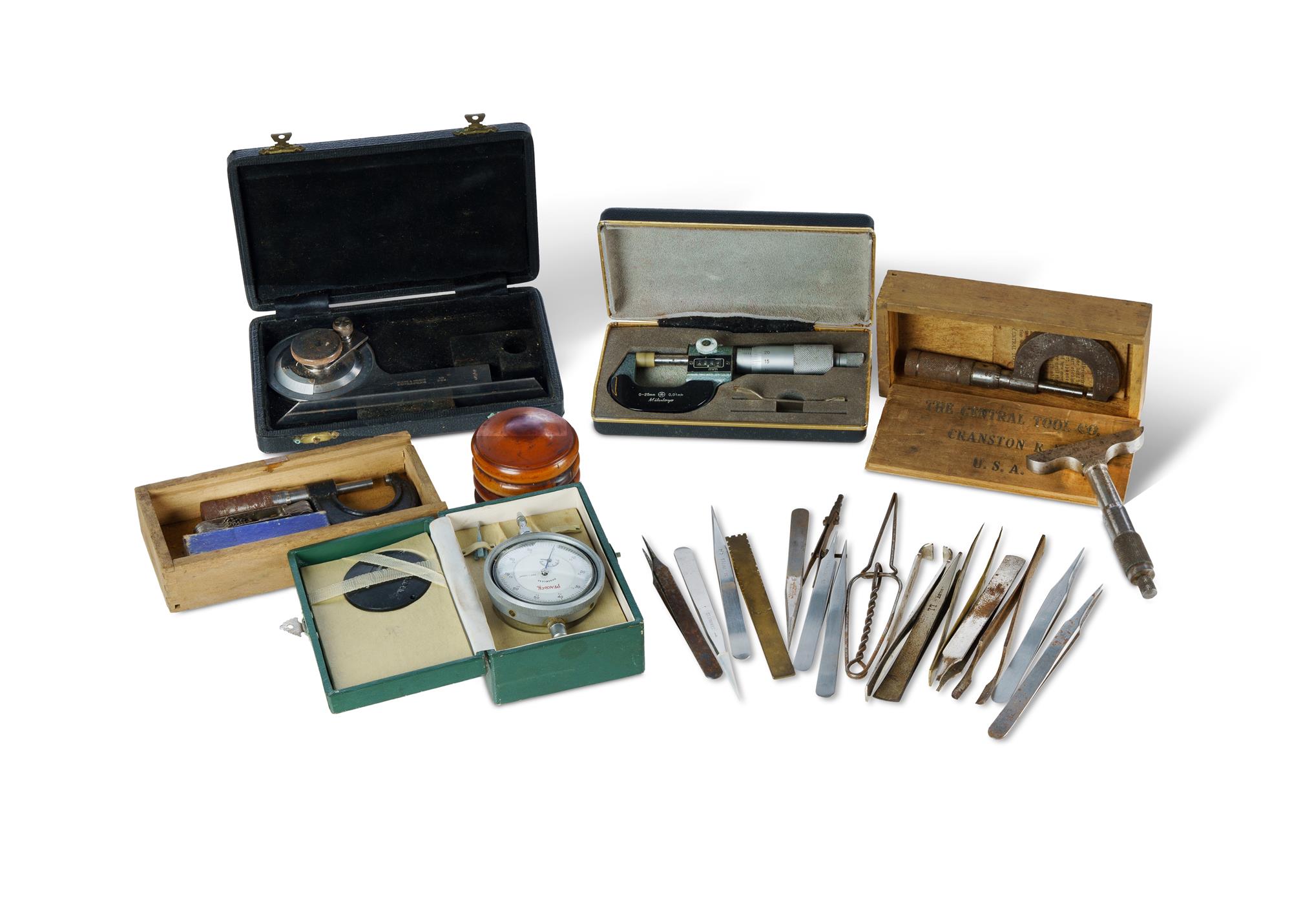 Various Watchmakers Tools Includes boxed Moore & Wright angle gauge; Mitutoyo digital read micrometer in mm; Starrett depth micrometer; Peacock dial gauge; Starrett micrometer; central micrometer; and boxwood cased surface plates.Estimate $80-150