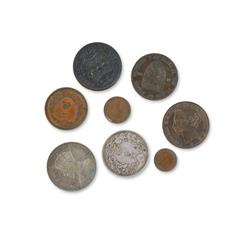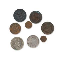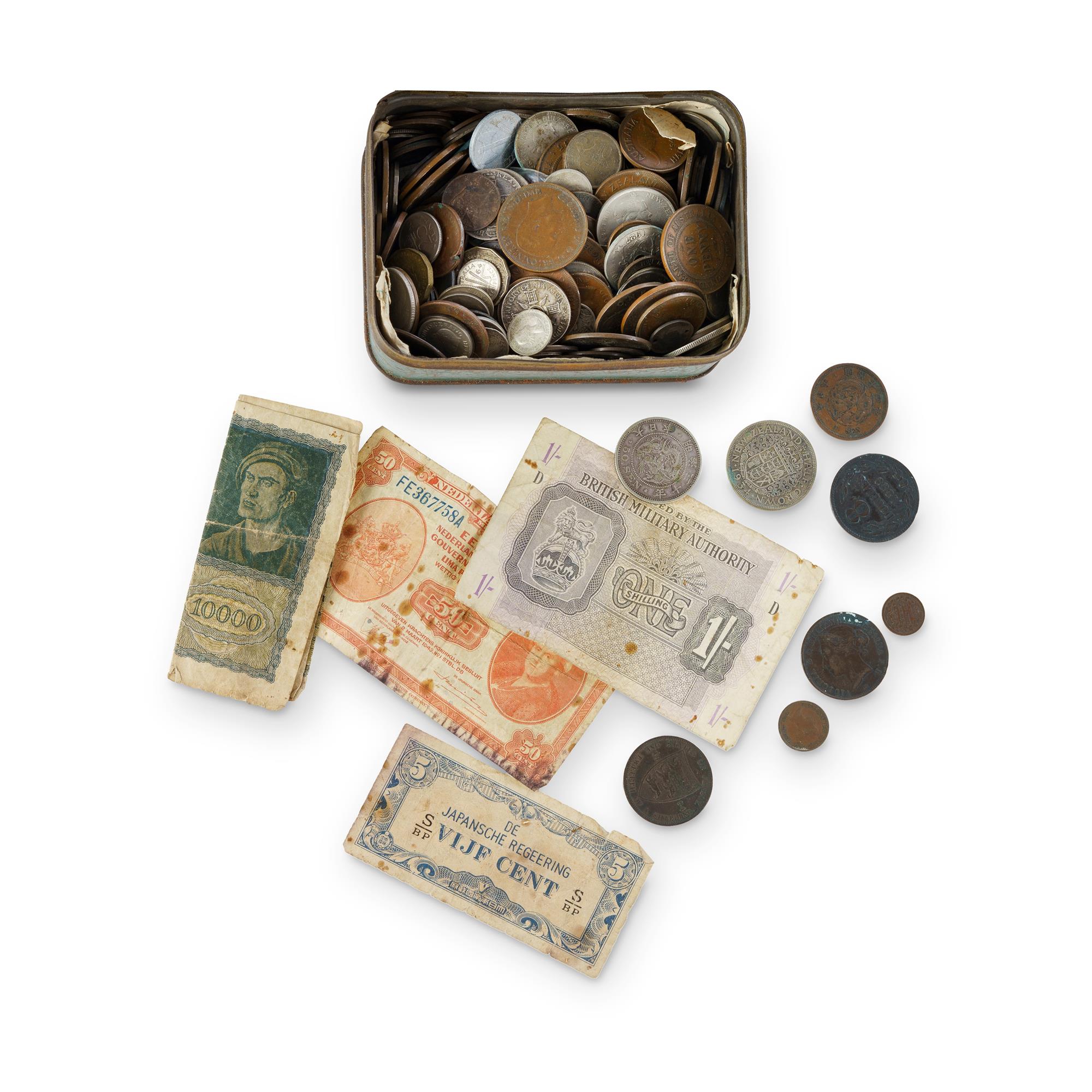 Tin of Assorted World Coins 19th C and 20th C mixed coins including some Australian pennies and silver, though majority world issues. Noted, half farthing 1843; third of a farthing 1913; NZ Crown 1934; Guernsey 8 Doubles 1889; 50 Sen dragon. Inspection recommended.