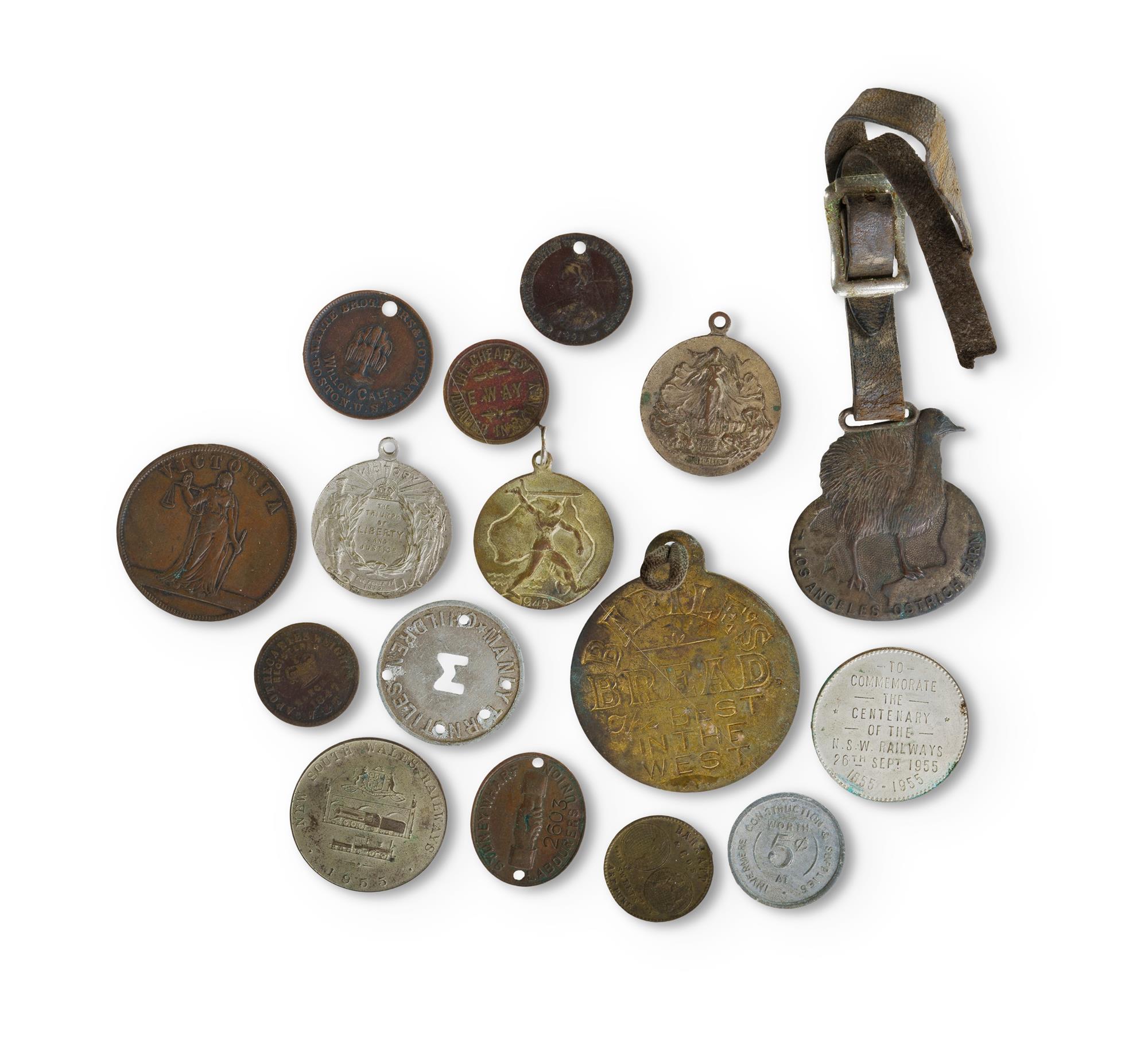 16 Various Tokens, Medallions and Fobs Includes Los Angeles Ostrich Park fob; Sydney Wharf Labourers Union membership; E. Way, Sydney token; 2 x 1919 Victory medallions; Barratt's Sweets tokens; White Bros. (US) token; Geo. Petty, Melbourne token etc.