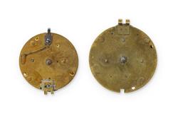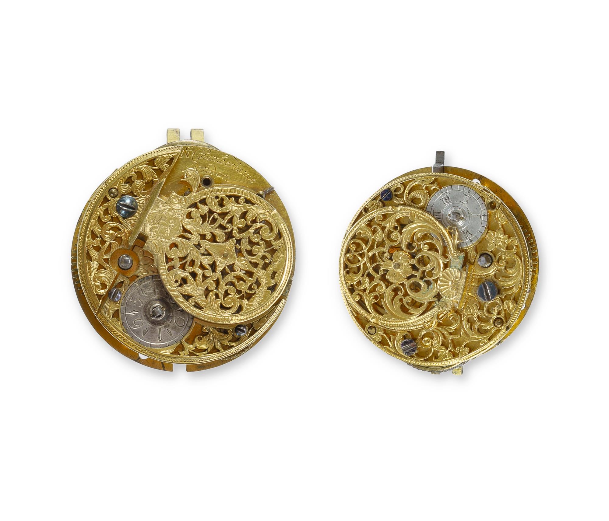 2 17th C Verge Movements Includes movement marked N. Chamberlaine (Nathaniel Chamberlaine active 1660s?) deep movement with Egyptian pillars and spring pre tensioner worm under the barrel, finely pierced and chased balance cover featuring the face of Chronos, an urn and phoenix, balance poised; and another movement with filigree pillars, balance A/F. (Dia.39mm)