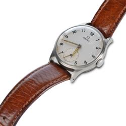 Gents Omega Wristwatch Base grade sub seconds movement in a stainless steel snap case. Dial and case (33mm) good, runs and stops.Estimate $150-250