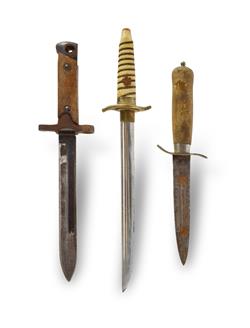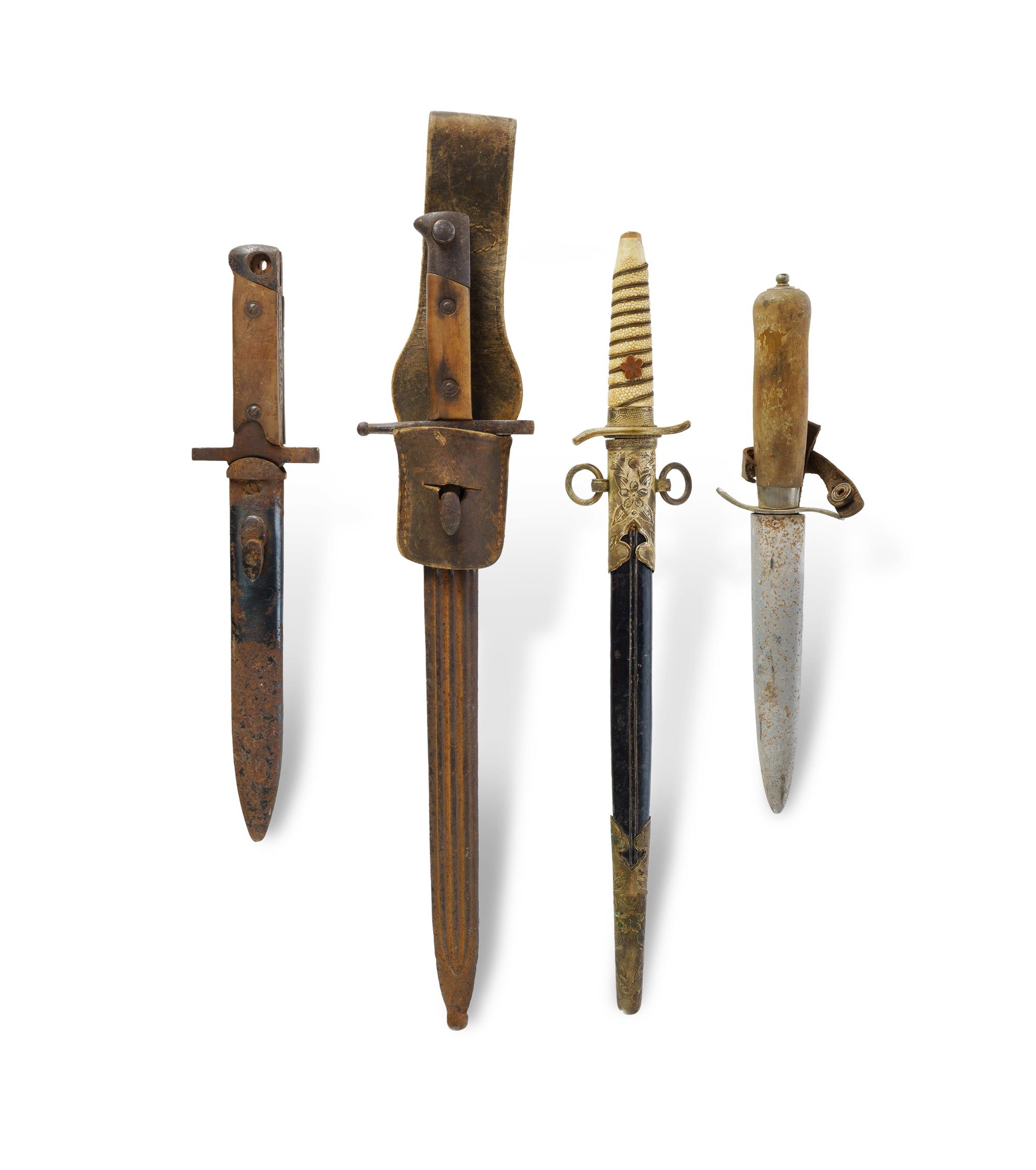 Group of 4 Knives Includes Italian Carcano M1891 bayonet; Carcano M38 bayonet; Imperial Japanese navy dirk; and Swedish Mocara diving knife.Estimate $60-120