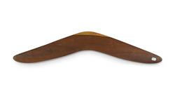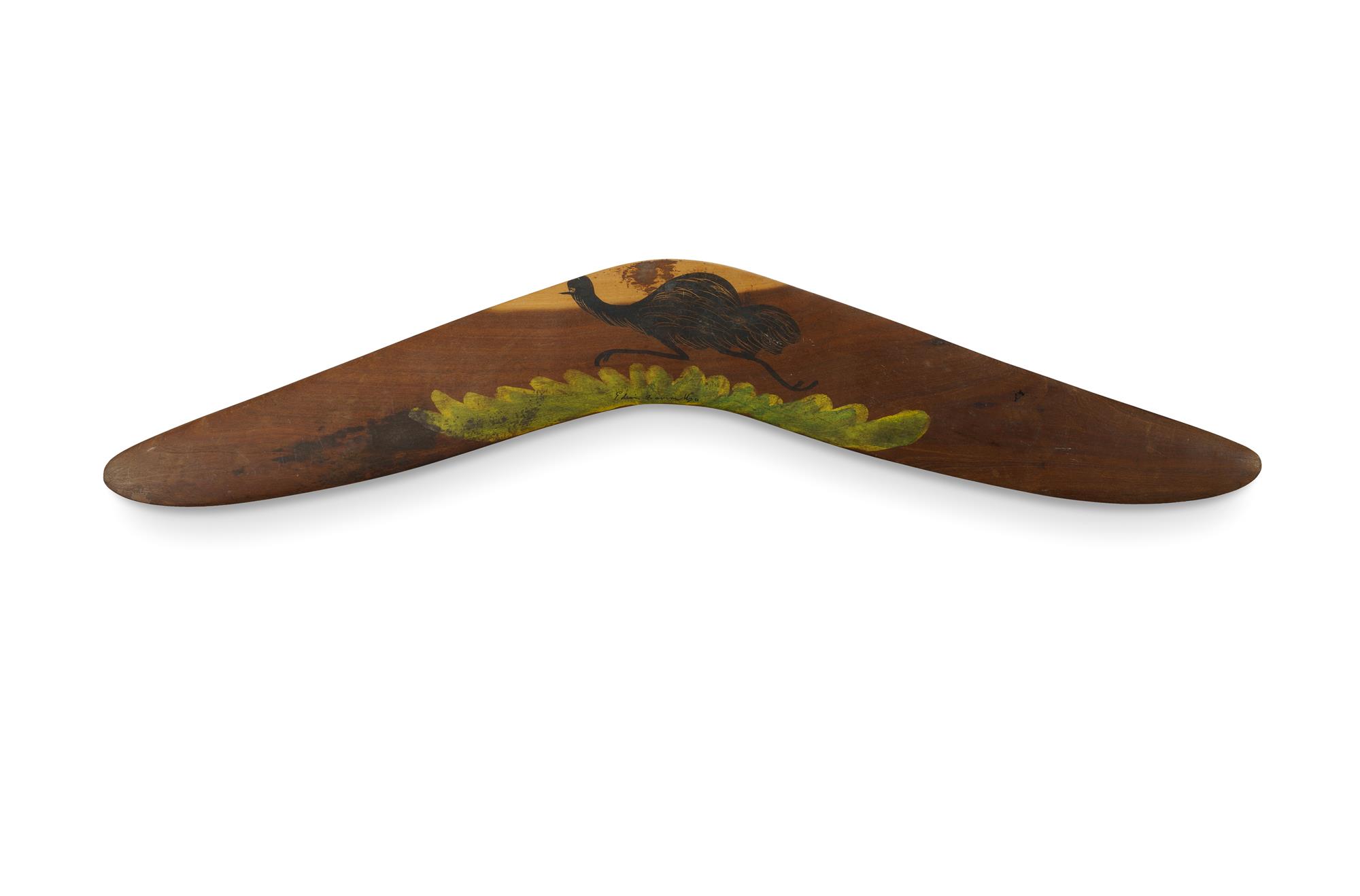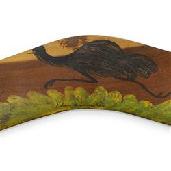 PAREROULTJA Edwin (Aboriginal 1918-1986) Emu Painted Mulga Wood Boomerang. Signed centre, and inscribed verso 'Aboriginal Handicraft Hermannsburg Central Australia'. (L60cm)Estimate $200-400