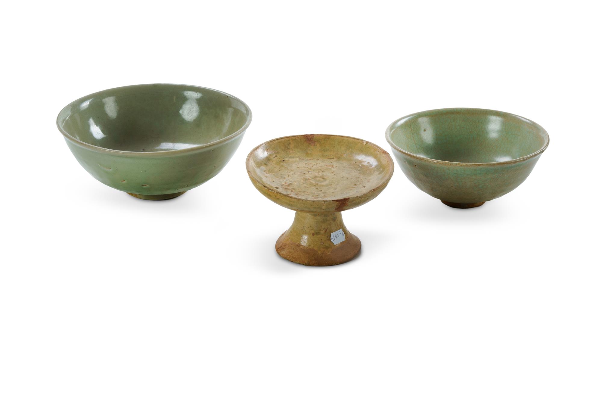 3 Sawankhalok Celadon Pottery Items Includes 2 various bowls, and a stem footed dish. (Dia.19cm, 15.5cm & 13cm)Estimate $100-200