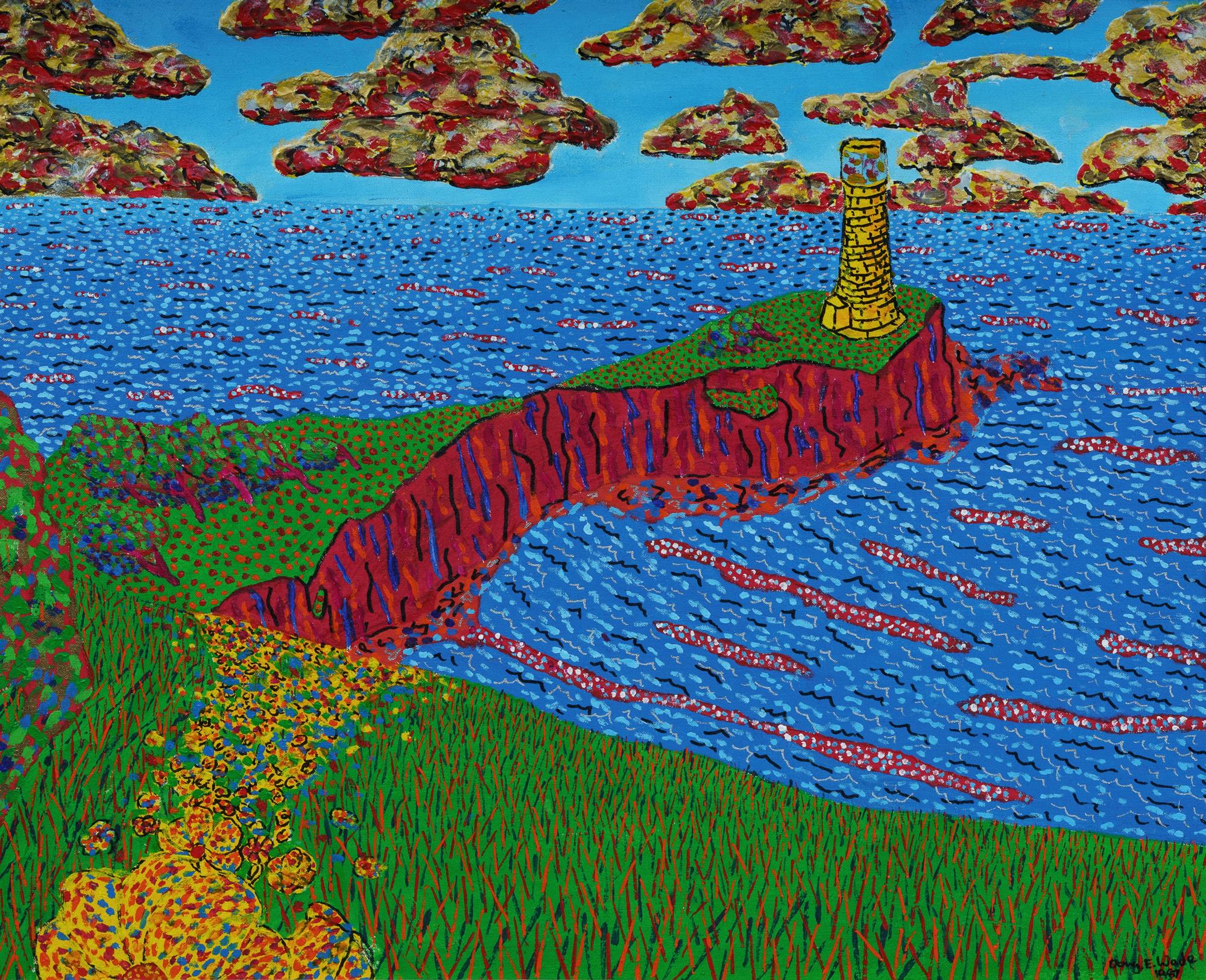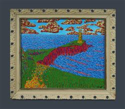 WADE, Doug E. (working 1980s) Coastal Scene with Lighthouse, 1987. Signed lower right. Acrylic & Mixed Media on Canvas on Board 48.5x58cm PROVENANCE: The Fred and Elinor Wrobel Collection, Sydney; Estate Late Elinor Wrobel.Estimate $100-200