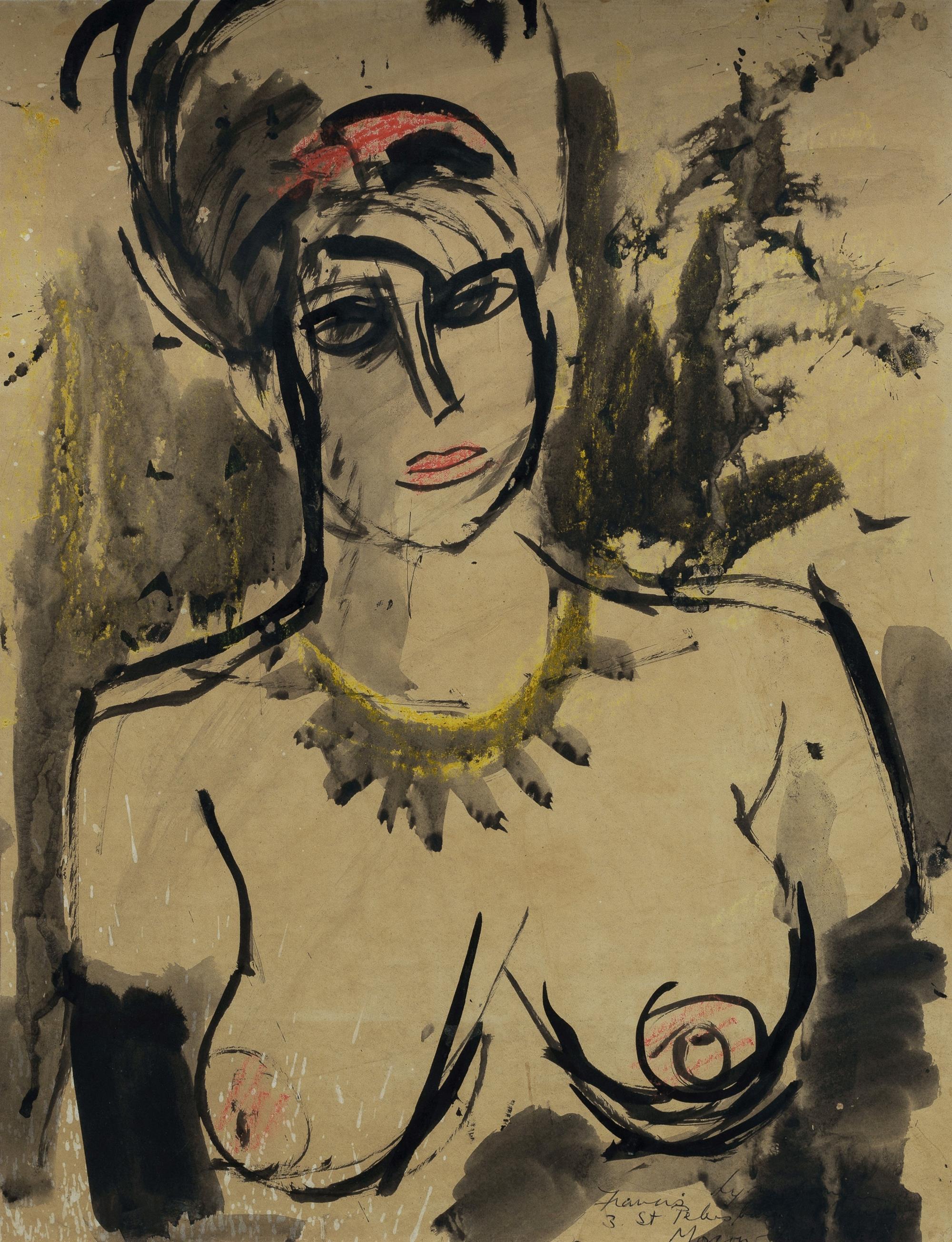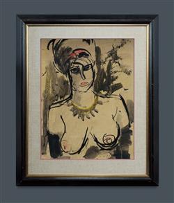 LYMBURNER, Francis (1916-1972) Nude with Necklace, c.1959. Signed lower right, and inscribed with artist's London studio address. Ink & Coloured Crayon 54x41cm PROVENANCE: Bonhams & Goodman, Sydney, 8th November 2004 (lot 9)Estimate $500-800