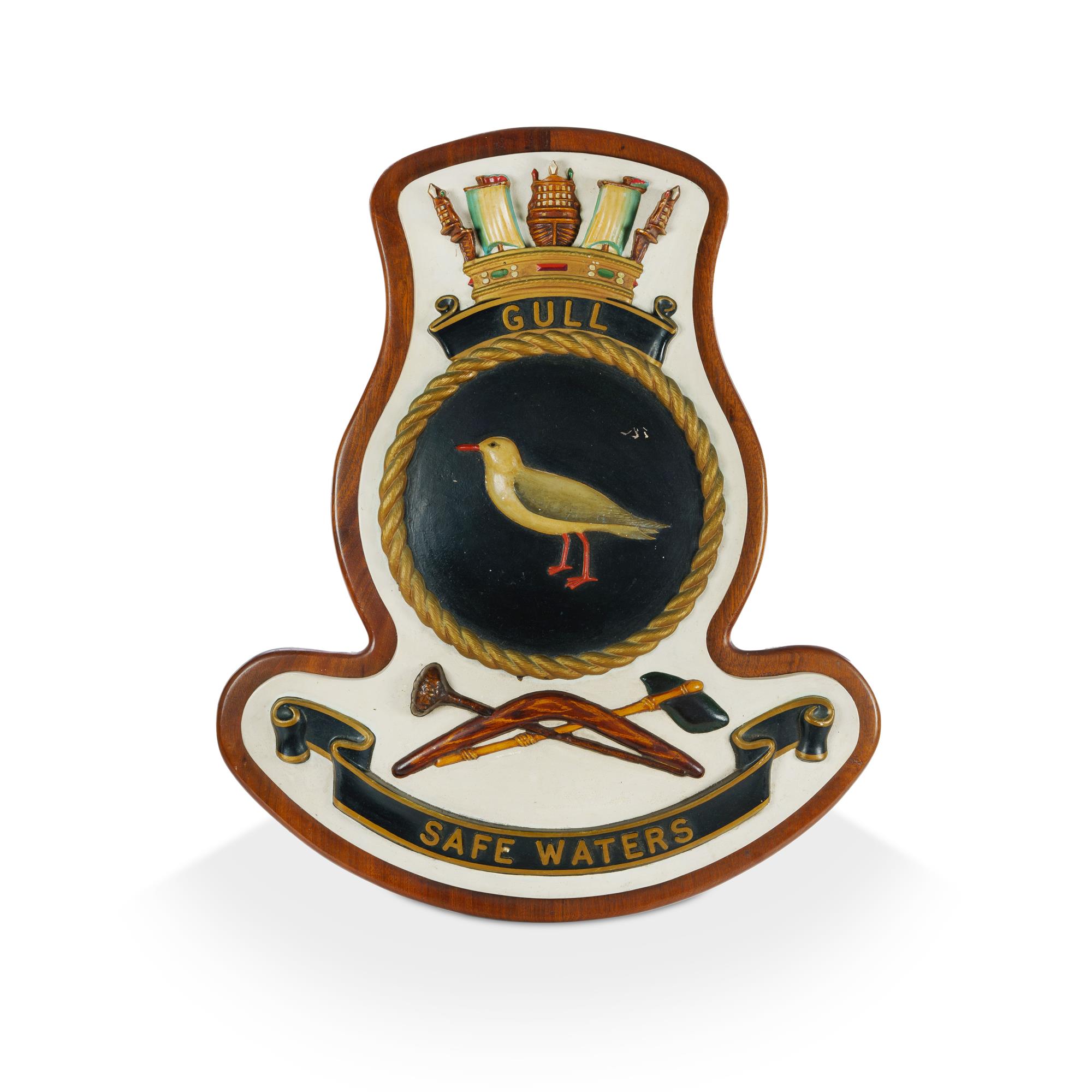 Original Ships Badge from the Ran HMAS Gull Ton class minesweeper acquired from Royal Navy in 1961, retired in 1969. (82x69cm)Estimate $700-1,000