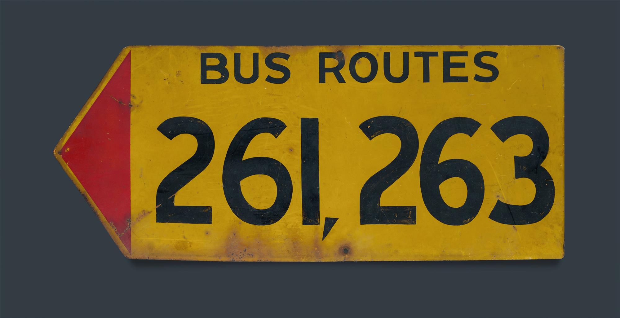 1960s Lane Cove Bus Route Sign Hand-painted steel sign for bus routes 261 and 263. (25x61cm)Estimate $50-100