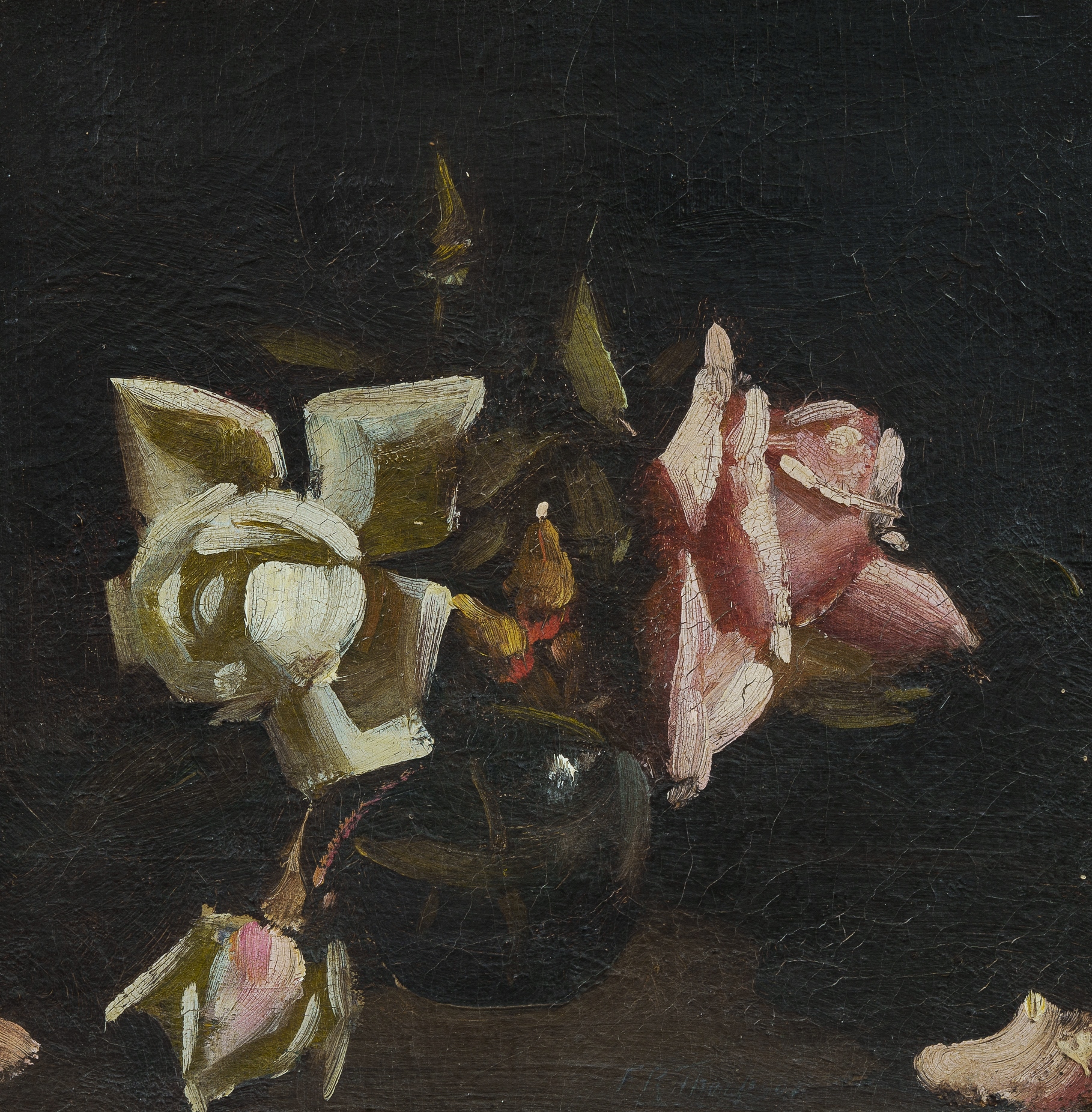 THOMPSON, Francis Roy (1896-1966) Still Life with Roses Signed 'FR Thompson' lower right. John Thallon frame (original label verso) Oil on Canvas on Board 29x29cmEstimate $400-700