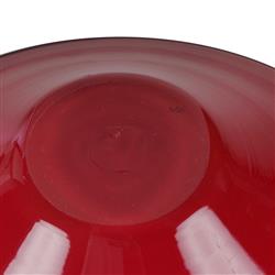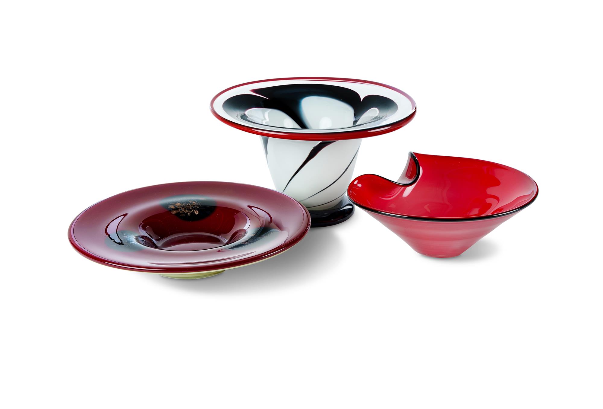 3 Art Glass Pieces Includes oxblood cased glass dish with aventurine inclusions set in black ovals; crimson bowl with folded lip, black under rim, engraved JP to base; and clear cased glass bowl with white and deep purple swirl, red rim (bruise inside) (H16cm Dia.28.5cm & 23.5cm)
