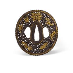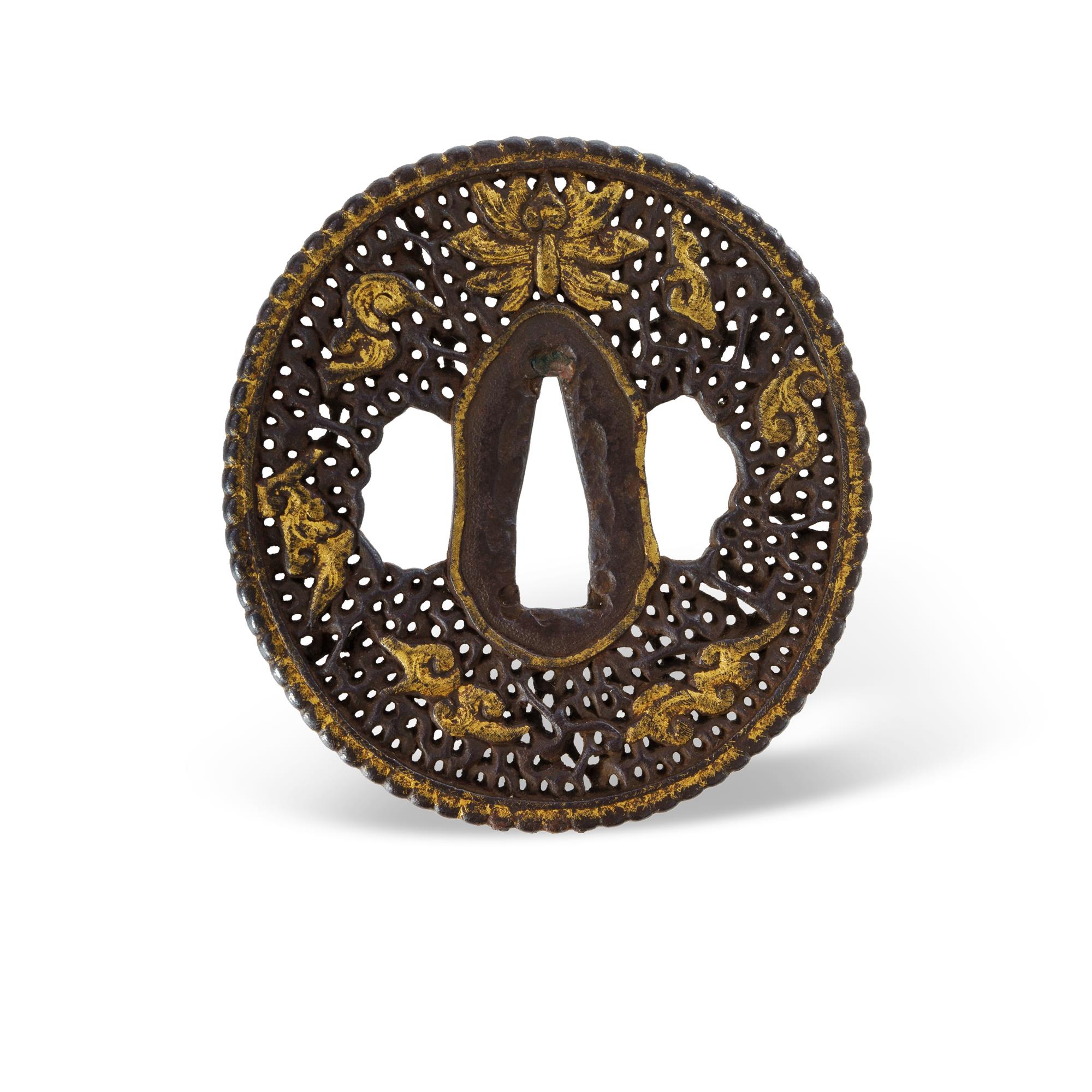 Japanese 18th C Iron Nanban Tsuba Naga maru gata form, with pierced and gilt decoration. (7.2x6.5cm)Estimate $350-550