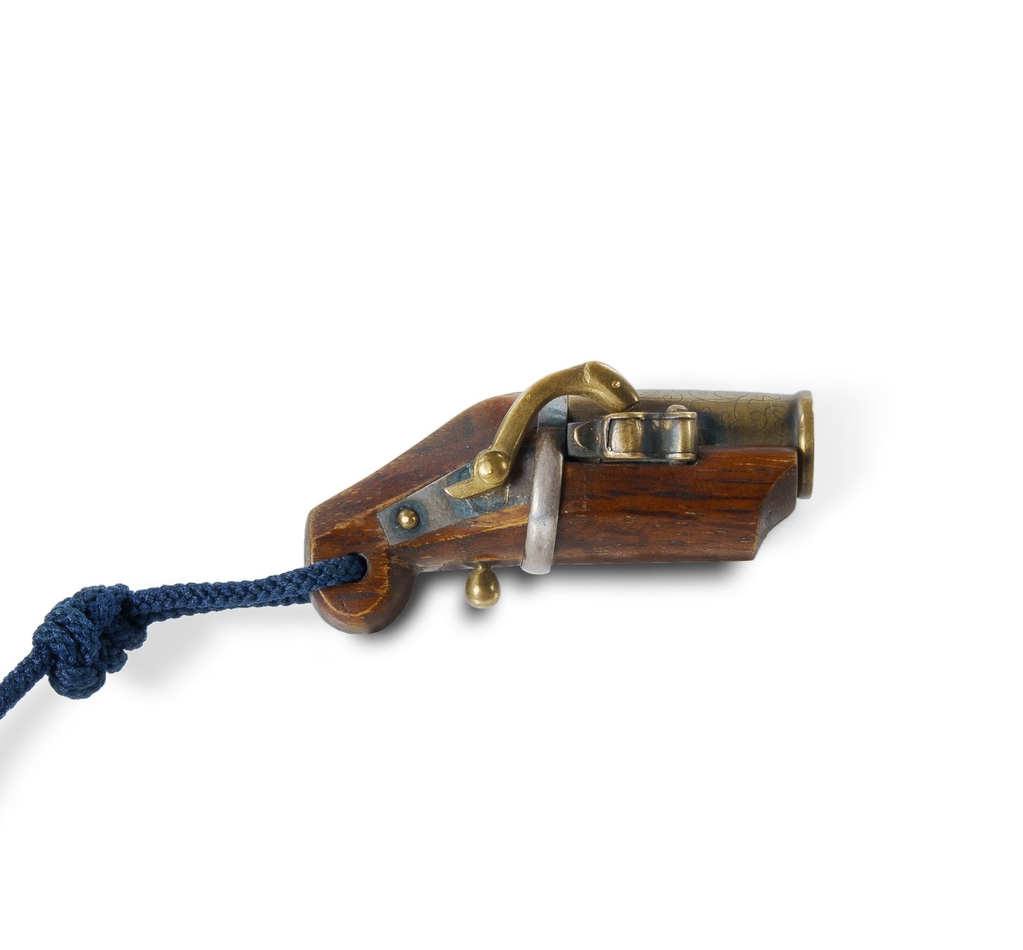 Rare Japanese Netsuke of a Matchlock Pistol (Teppo) Wooden stock with brass and silver mounts. Engraved gun barrel. (L5cm)Estimate $600-900