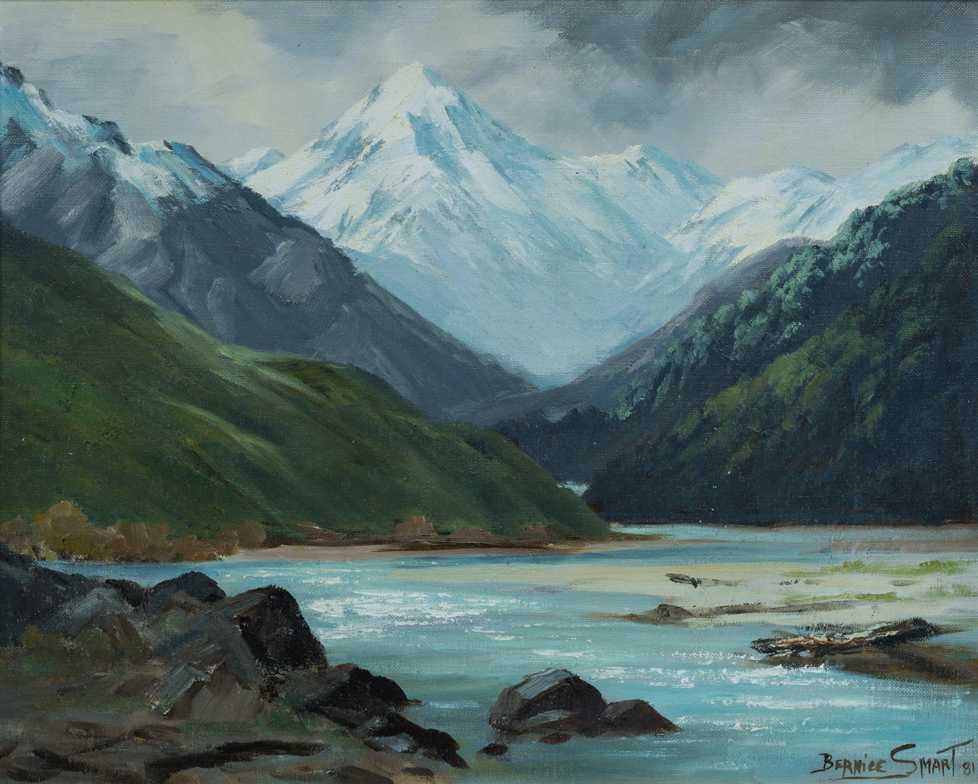 SMART, Bernice (New Zealand, working c.1949-1977) 'Makarora Valley, Haast Pass Road [NZ]' 1981. Signed lower right, and inscribed verso. Oil on Canvas on Board 39x50cmEstimate $50-100