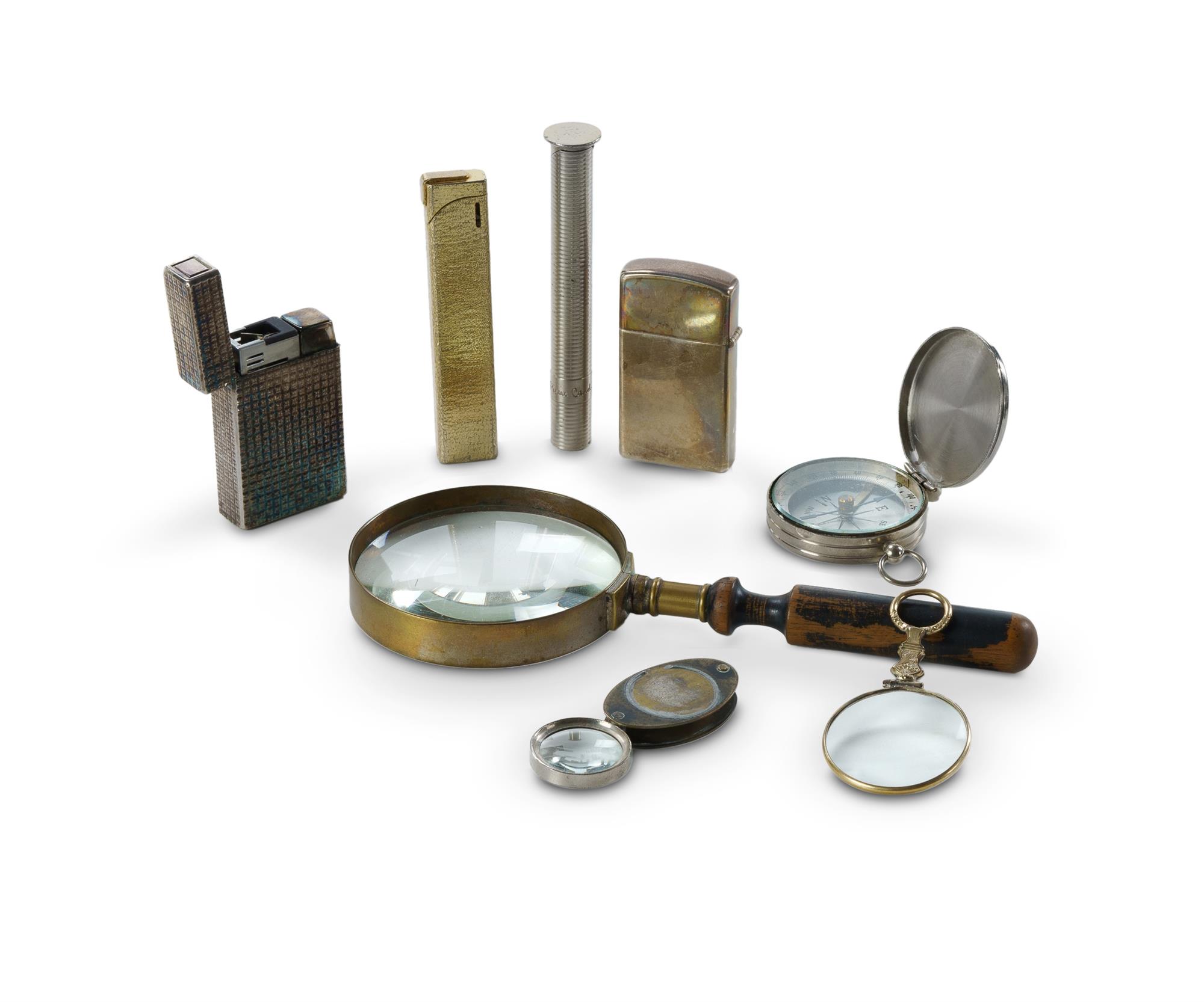 Group of Interesting Small Items Includes French chrome pocket compass; Georgian rolled gold quizzing glass; loupe magnifying glass, and one other; sterling silver cased Zippo lighter; and 3 other various lighters.Estimate $60-100