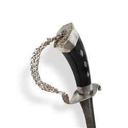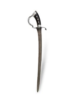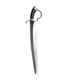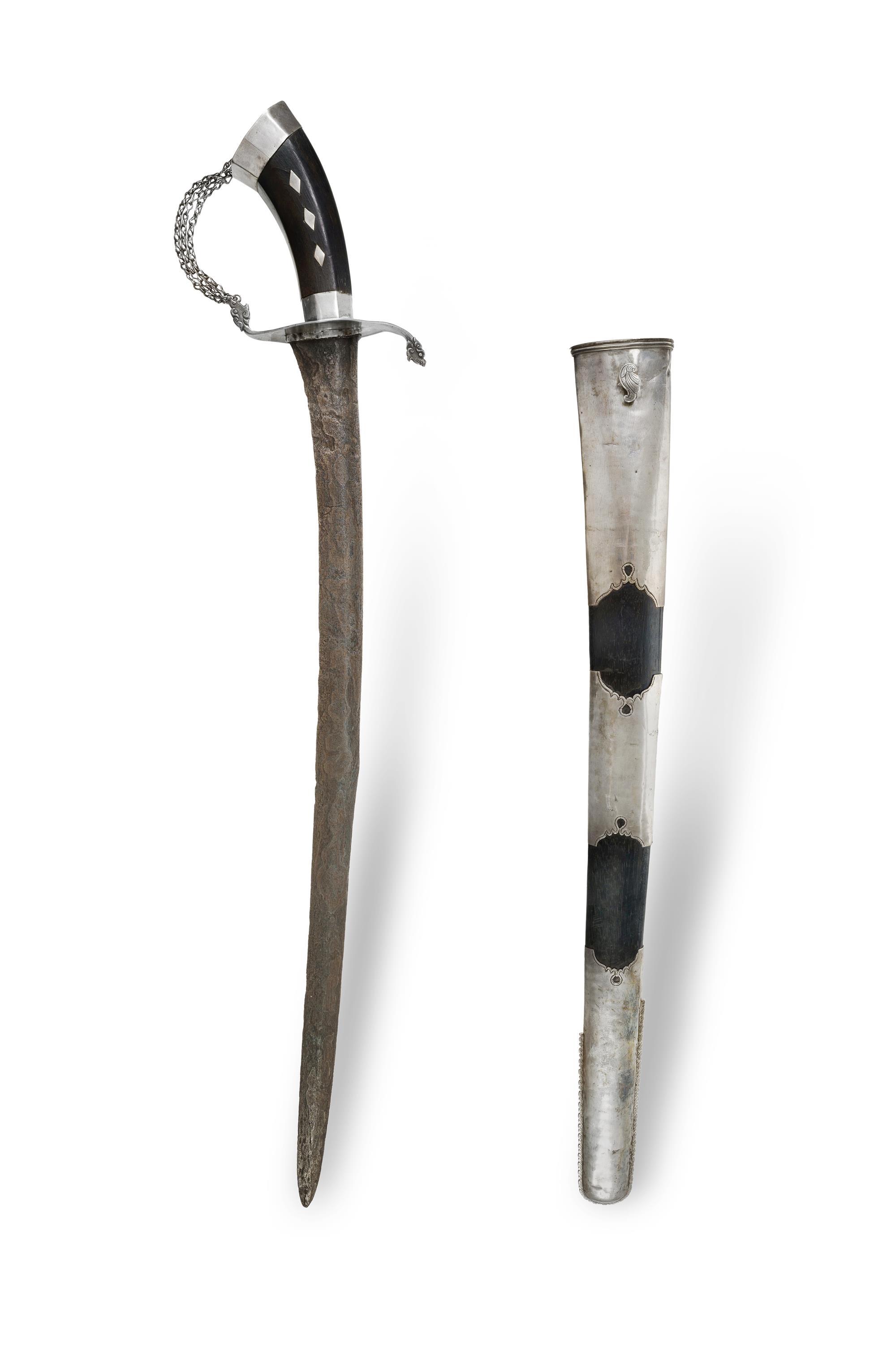 Indonesian 'Pedang Lurus' Gently curved pamor blade; the hilt and scabbard silver mounted on ebony. L50cm (blade) L62cm (total) PROVENANCE: From the collection of the late Warren MallardEstimate $300-600