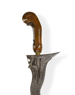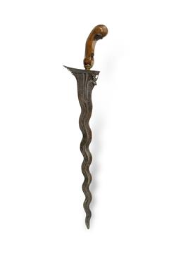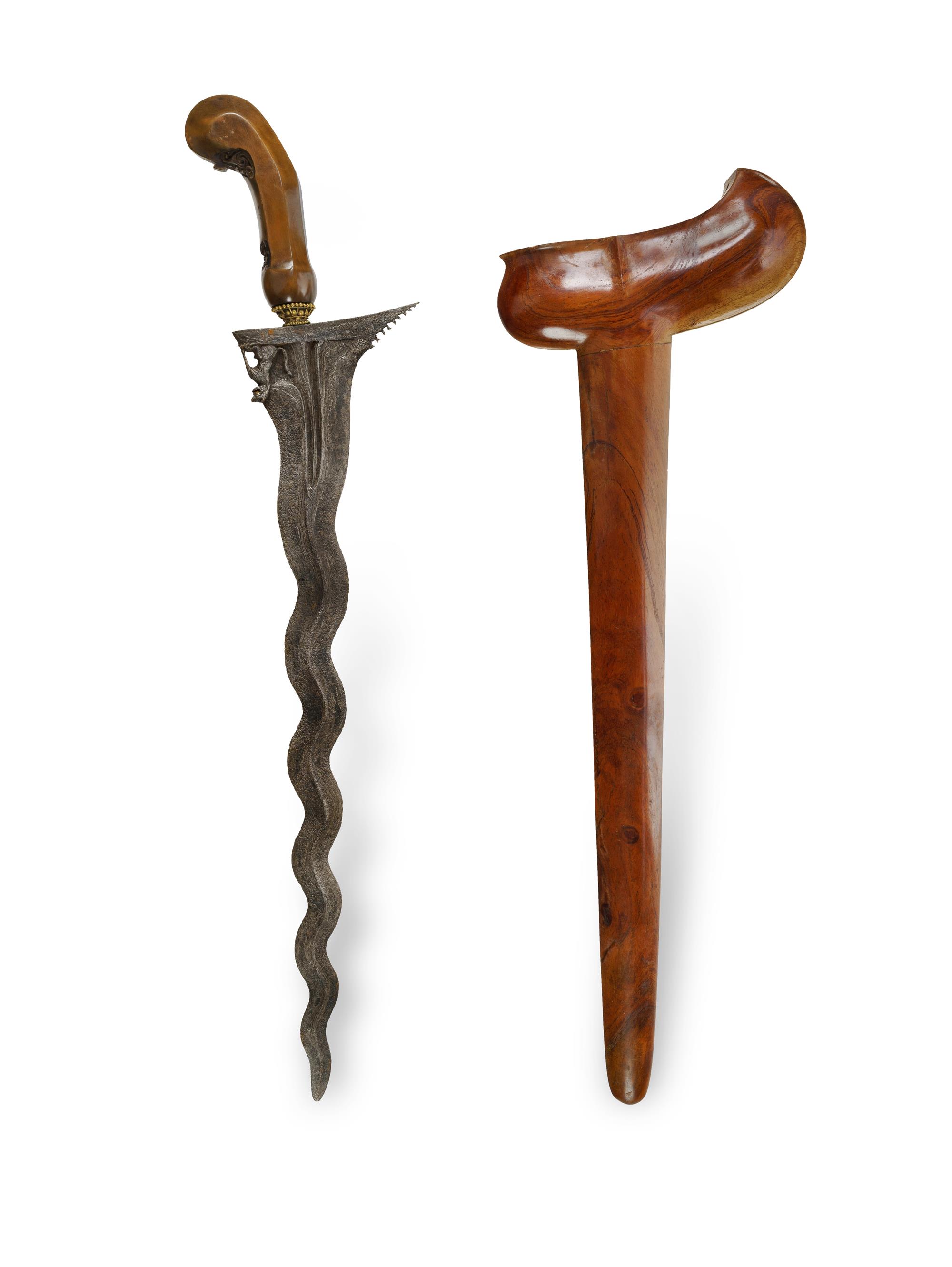 Javanese Keris Pamor blade with 13 luk (curves); the blade carved with seated lion, grasping a gilded ball in its mouth. (L50cm) PROVENANCE: From the collection of the late Warren MallardEstimate $400-600