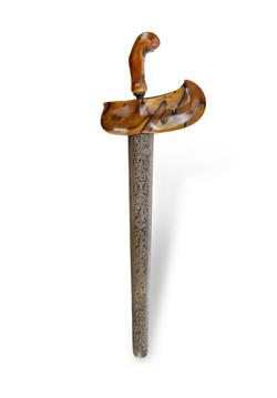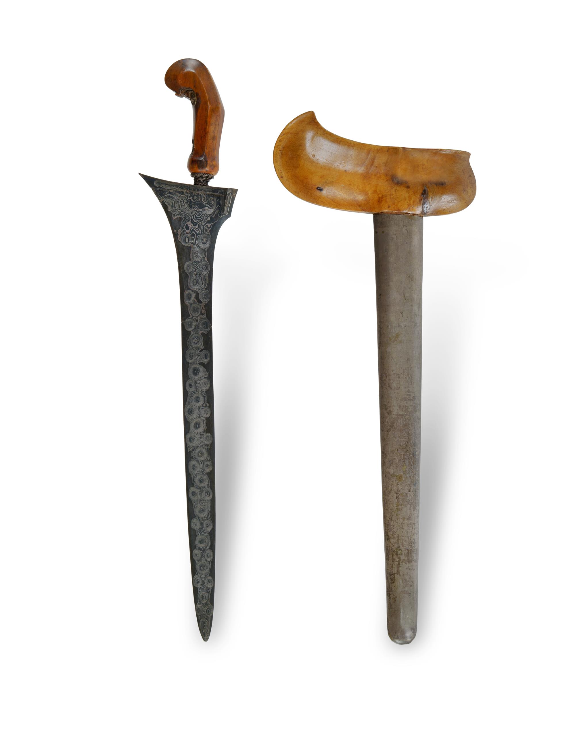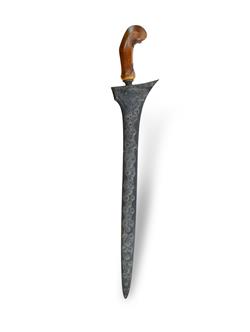 Indonesian Keris Straight, double edged pamor blade; scabbard with floral embossed silver sheet covering. (L48cm) PROVENANCE: From the collection of the late Warren MallardEstimate $200-400