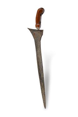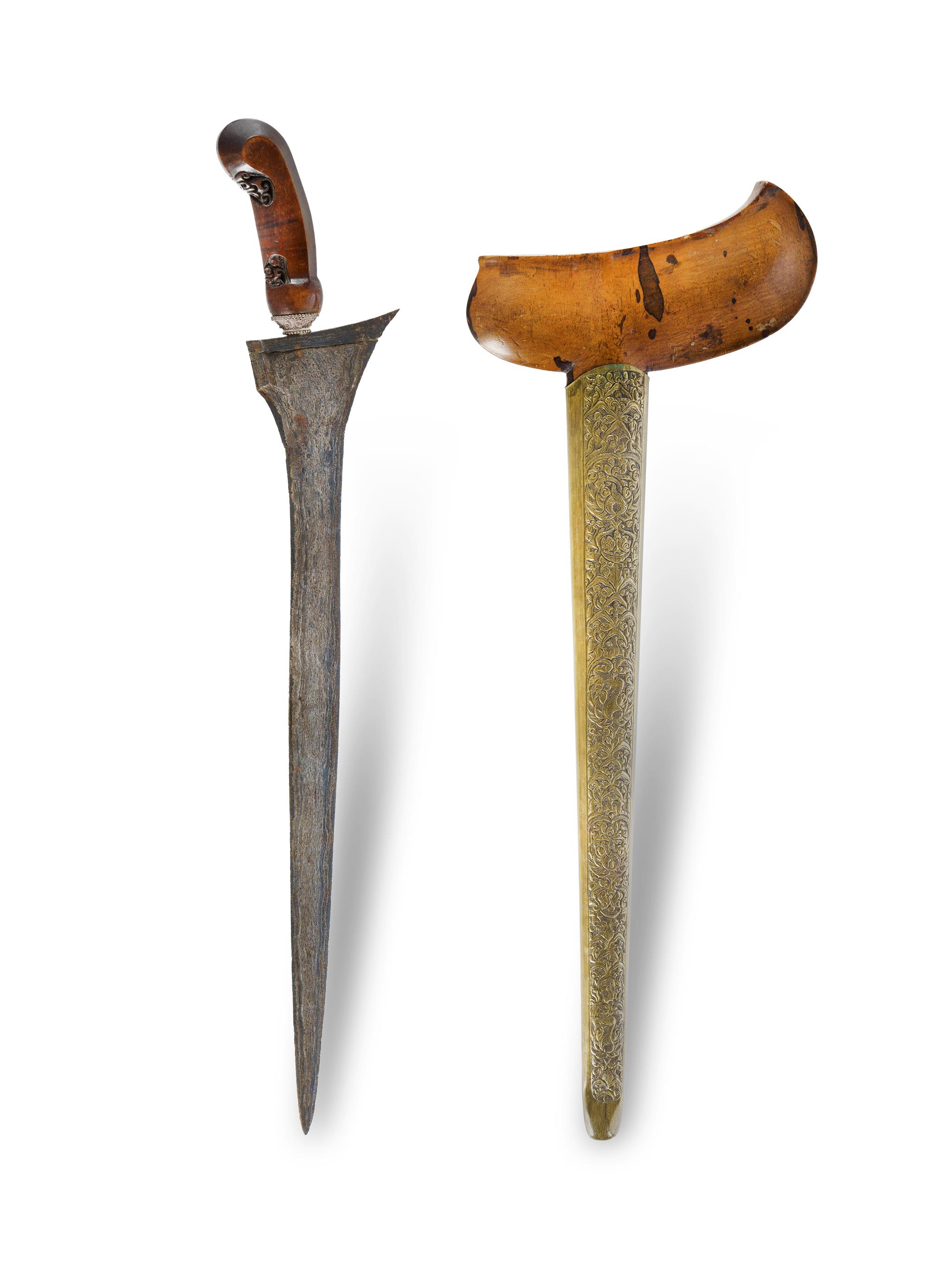 Balinese Keris With straight pamor blade; gold mendak and solo hilt; scabbard with repousse brass sheath. L49cm (total) PROVENANCE: From the collection of the late Warren MallardEstimate $200-400