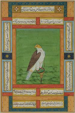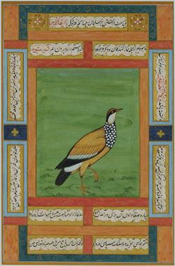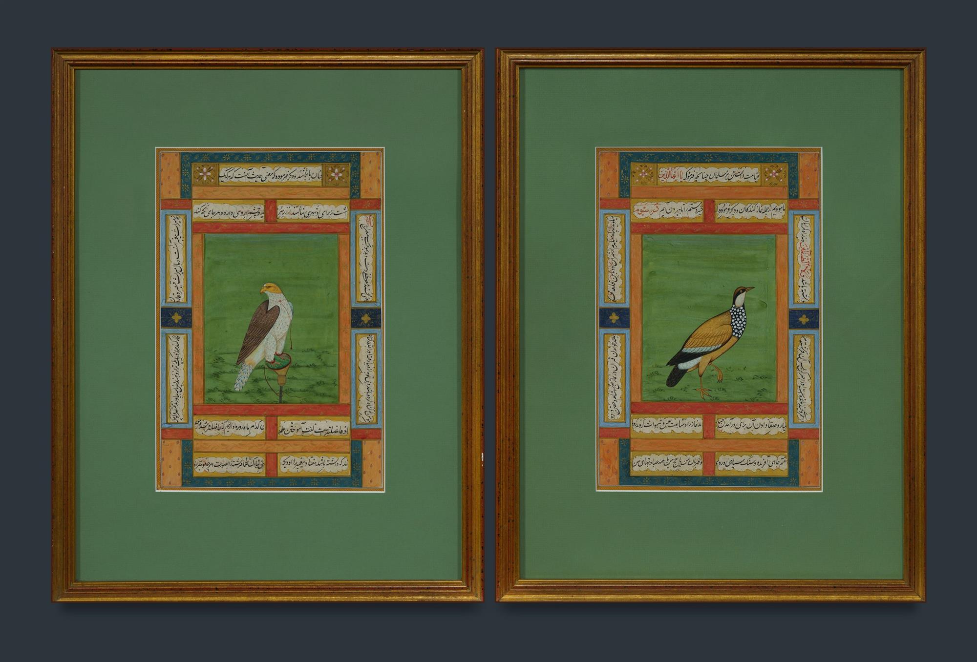 Pr Indian Illuminated Pages Birds with panel borders of nastaliq calligraphy. Ink, Gouache & Gilt on Paper (32x21cm each)Estimate $200-400