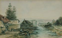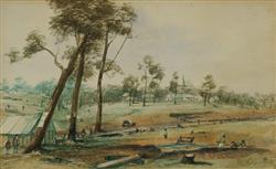 Australian Colonial School, Signed N. Crowther (2) The Old Tank Stream, Sydney (after an engraving by John Skinner Prout / T. Heawood), and Miners Camp (possibly the Gold Rush). Both signed lower right. W/Clr (2) 17x28cm (each)Estimate $100-200