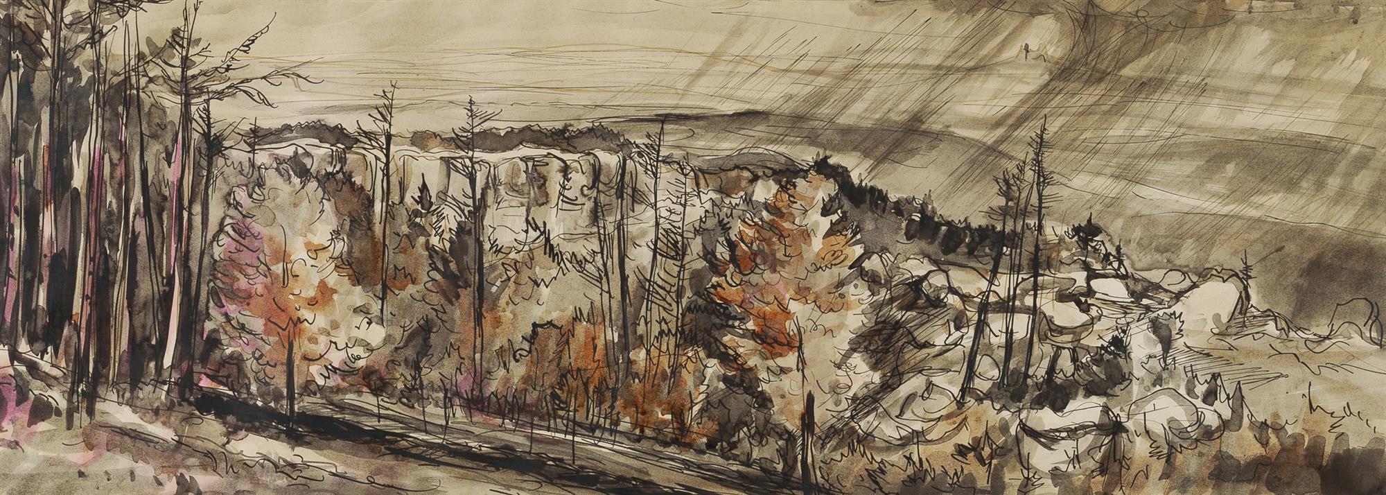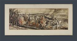Artist Unknown Landscape with Hillside and Rain Indistinct gallery stamp verso (likely European) Ink & W/Clr 23x64cmEstimate $50-100