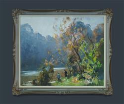 LOXTON, John S (1903-1969) 'Warrandyte Fishermen' Signed lower left; artist label verso. Oil on Board 50x60cmEstimate $400-700