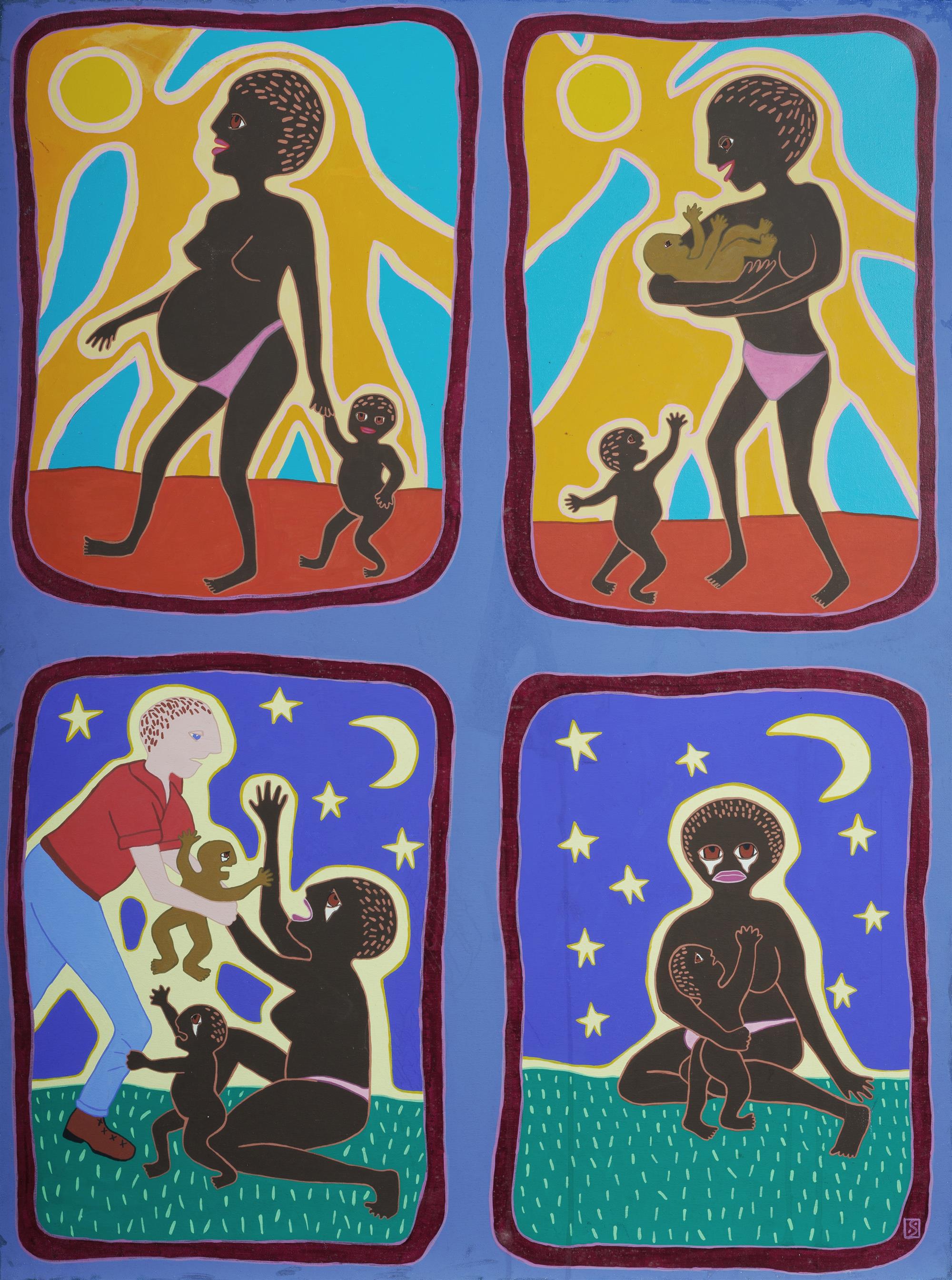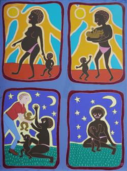 MORGAN, Sally (Aboriginal b.1951) Mixed Race Child Taken from Aboriginal Mother Label verso (perished) outlining story of the subject. Signed with artist's device lower right. Acrylic on Canvas 111.5x84cm PROVENANCE: Private collection, Sydney.Estimate $600-1,000
