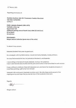 PERRY, Adelaide Elizabeth (1891-1973) 'Daffodils in Blue Jug' Signed lower left. Additional painting verso of South Coast, NSW (35.5x45.5cm) Oil on Board 44.5x34.5cm PROVENANCE: Margot Jackson Collection (great-niece of the artist)Estimate $1,200-2,500