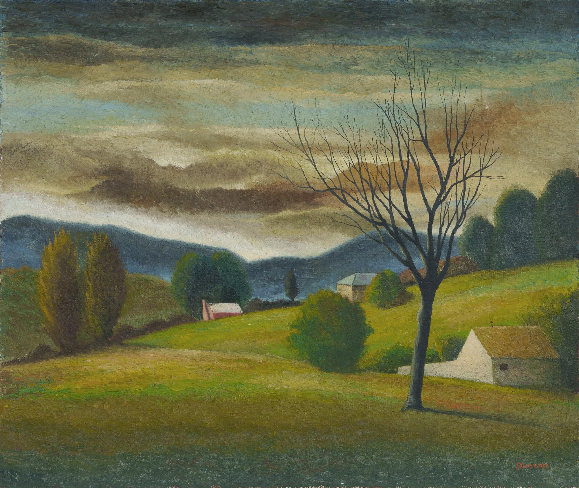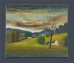 DUNCAN, George (1904-1974) 'Berrima Pastures' Signed lower right. Oil on Hessian 51x61cm PROVENANCE: Family of the ArtistEstimate $500-800