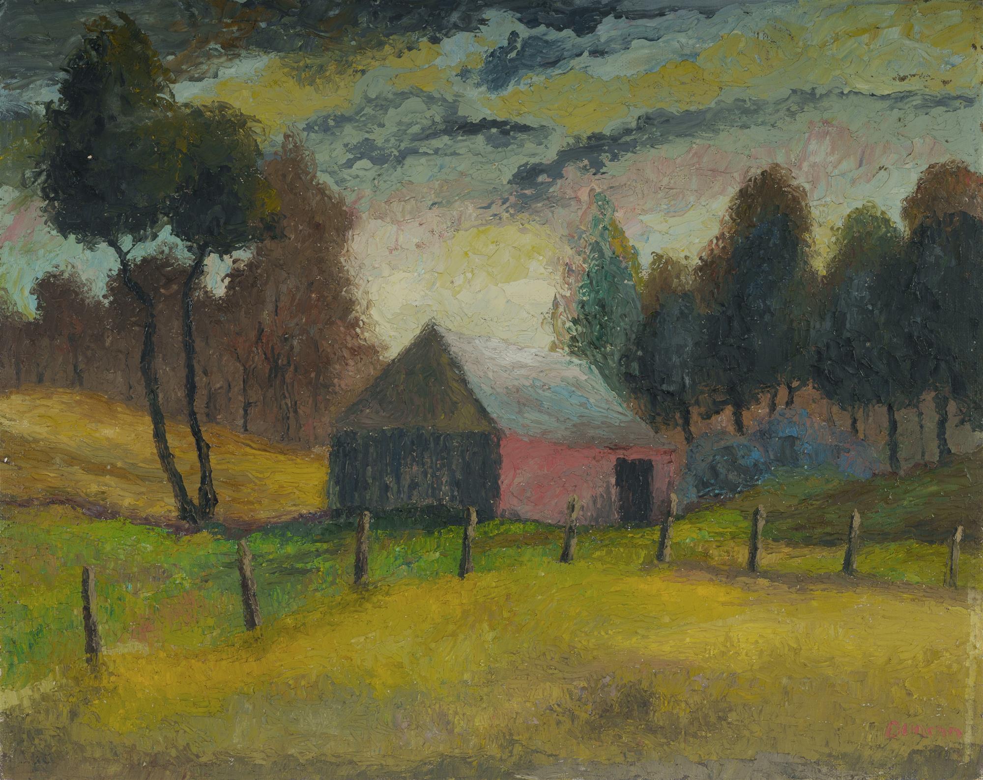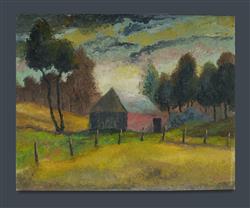 DUNCAN, George (1904-1974) Barn and Trees Signed lower right. Oil on Board 40.5x50.5cm PROVENANCE: Family of the ArtistEstimate $300-500