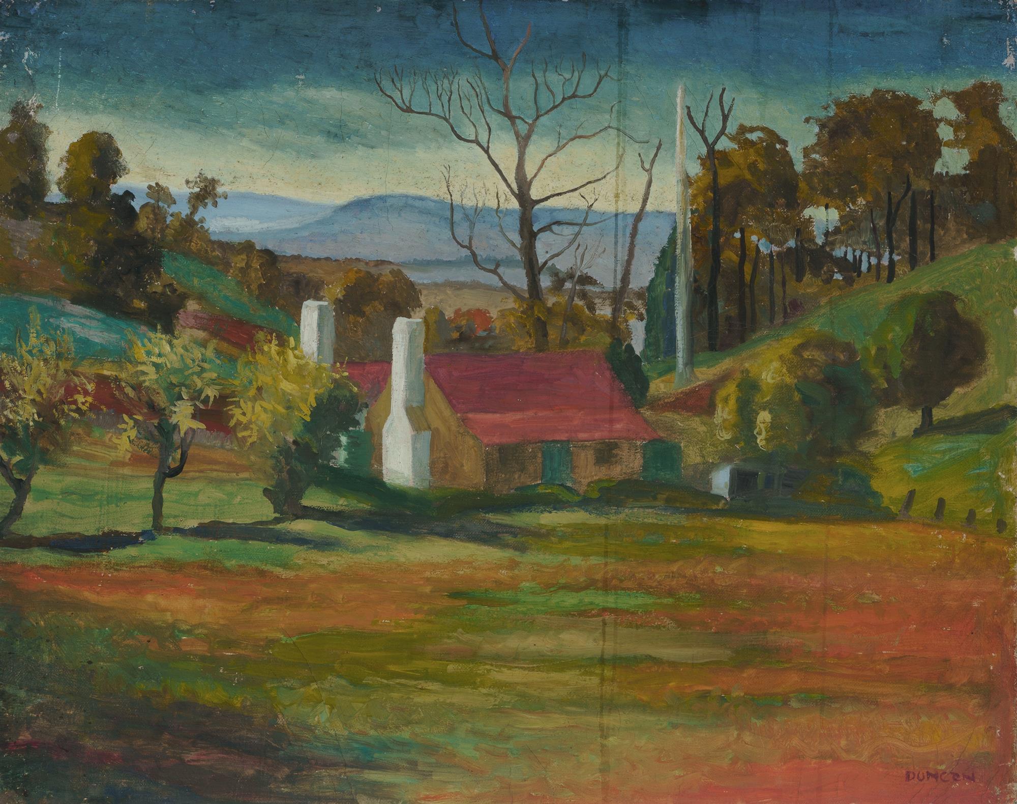 DUNCAN, George (1904-1974) NSW Landscape with Cottage and View to Distant Hills Oil on Canvas 40x50cm PROVENANCE: Family of the ArtistEstimate $250-450
