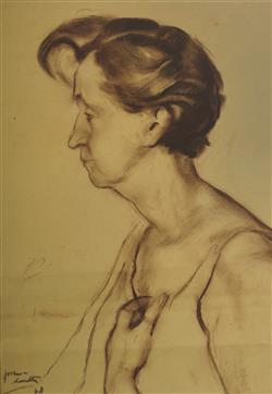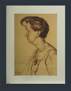SMITH, Joshua (1905-1995) Profile Portrait - Florence Broadhurst, 1968. Signed lower left. Conte 57x39cm PROVENANCE: Estate Late Joshua Smith; Estate Late Yvonne O'Hara-Close (artist Yve Close)Estimate $150-300