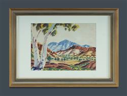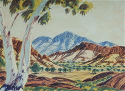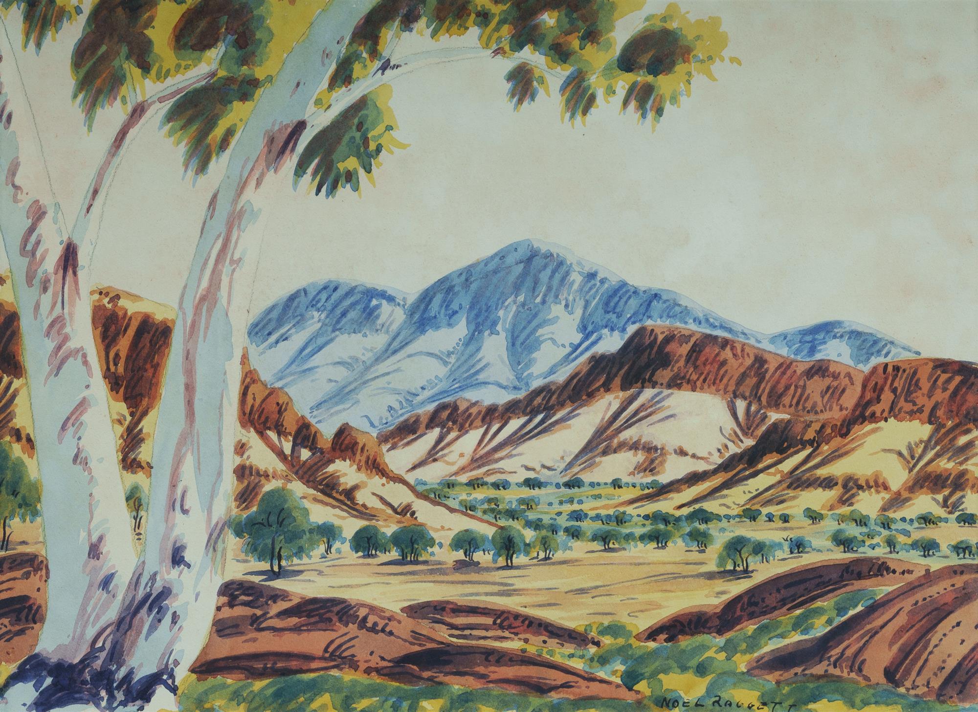 RAGGET, Noel (1937-1975) Ghost Gum with Mountain Ranges Signed lower right. W/Clr 26x35cmEstimate $300-500