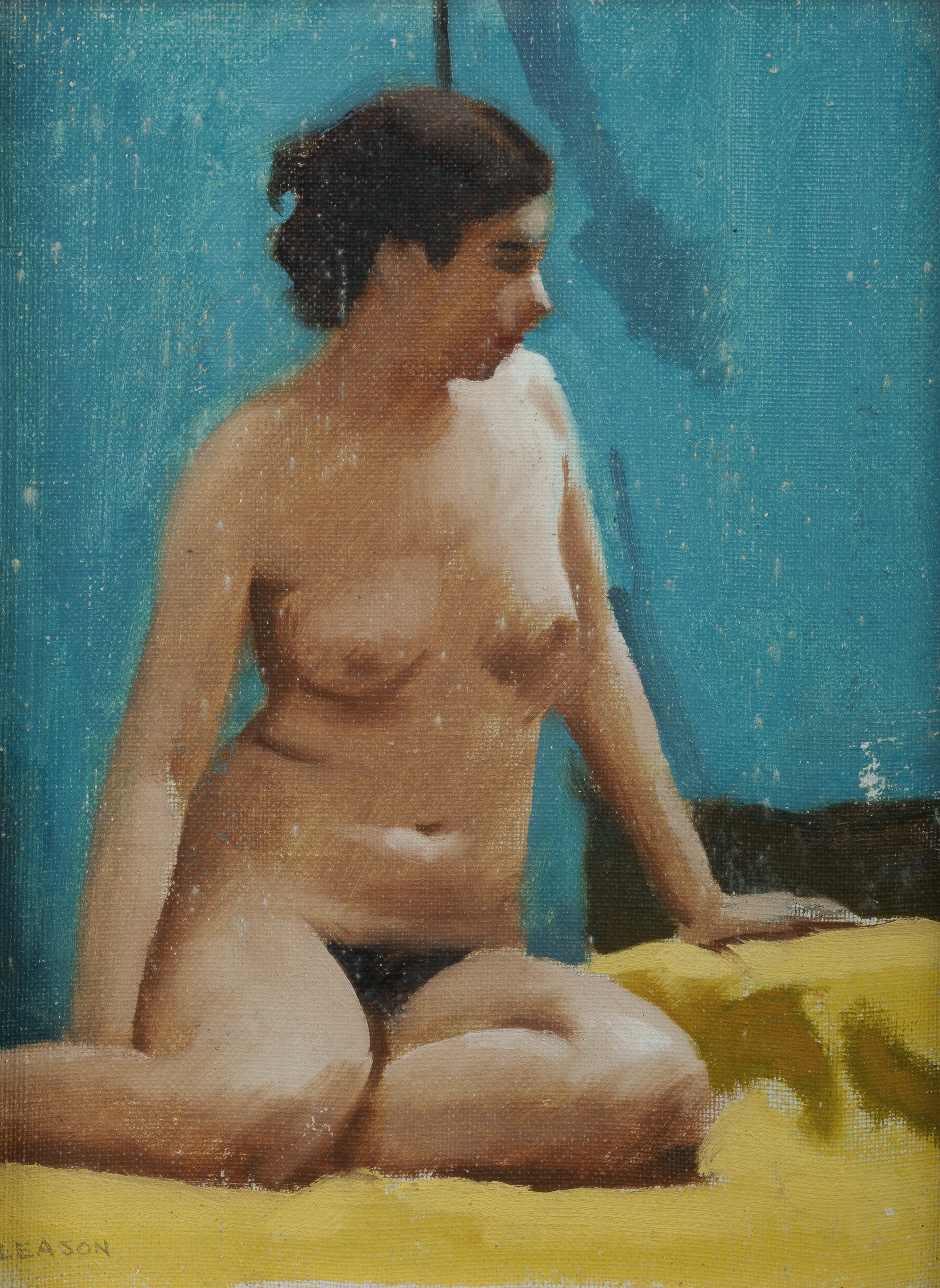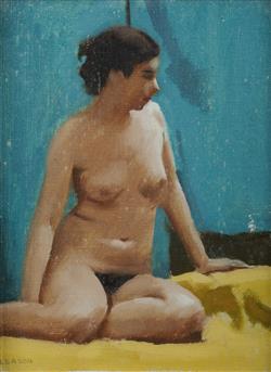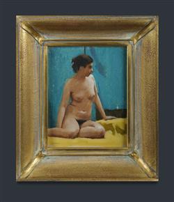 LEASON, Percy (1889-1959) 'Seated Nude on Yellow Throw' Signed lower left. Oil on Canvas on Board 25x19.5cm PROVENANCE: Deutscher-Menzies, Melbourne, 29th November 2000 (lot 212)Estimate $450-750