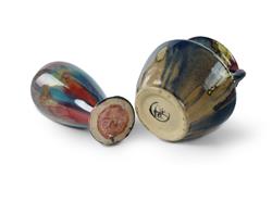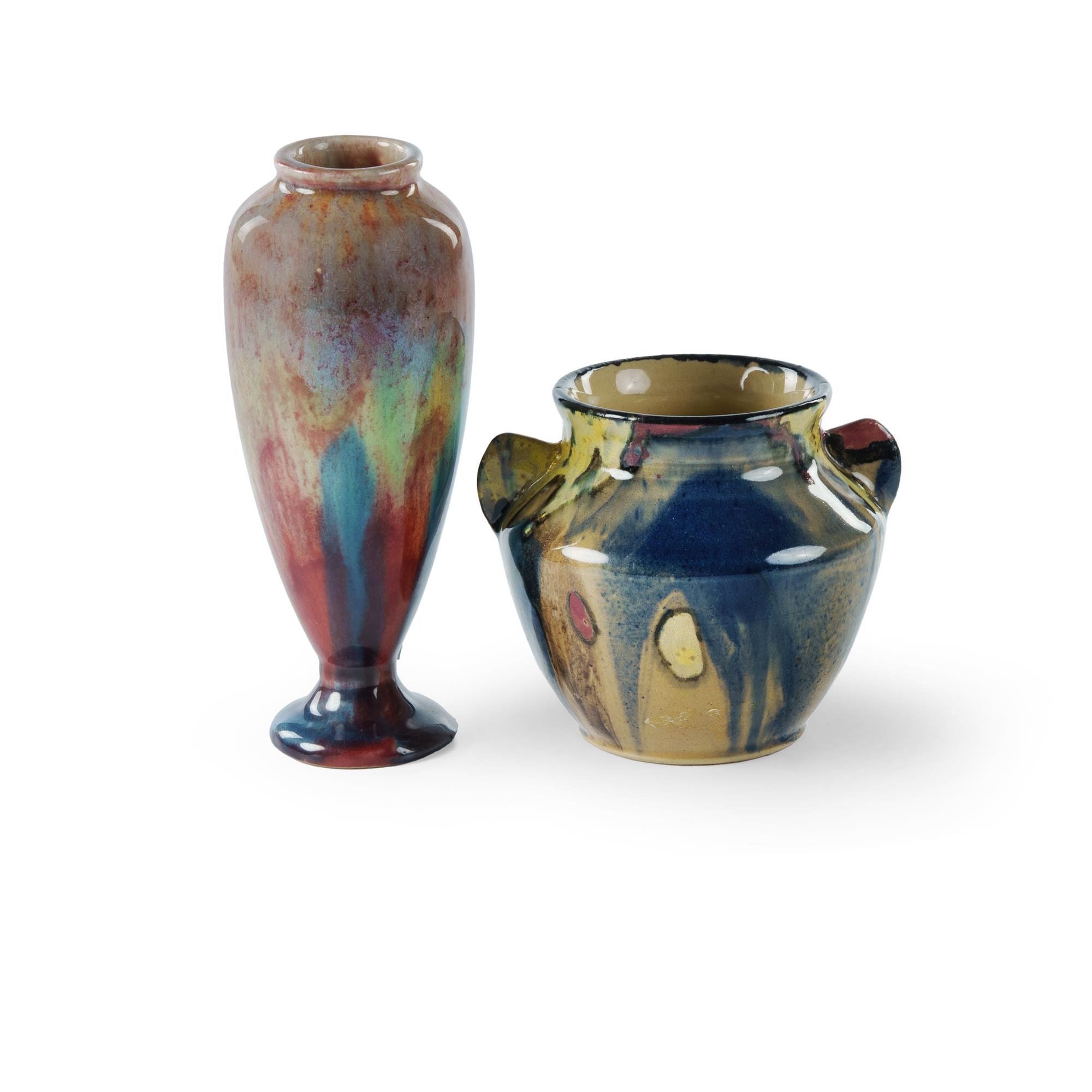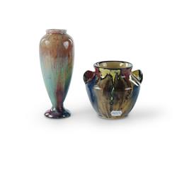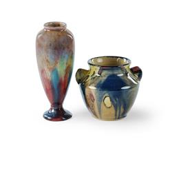 Premier Preston Pottery Vase (PPP) Twin handled squat vase with multi colour drip glaze, stamped 'PPP' to base. Together with another narrow vase. (H8cm, & 14cm)Estimate $150-300