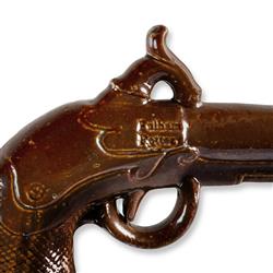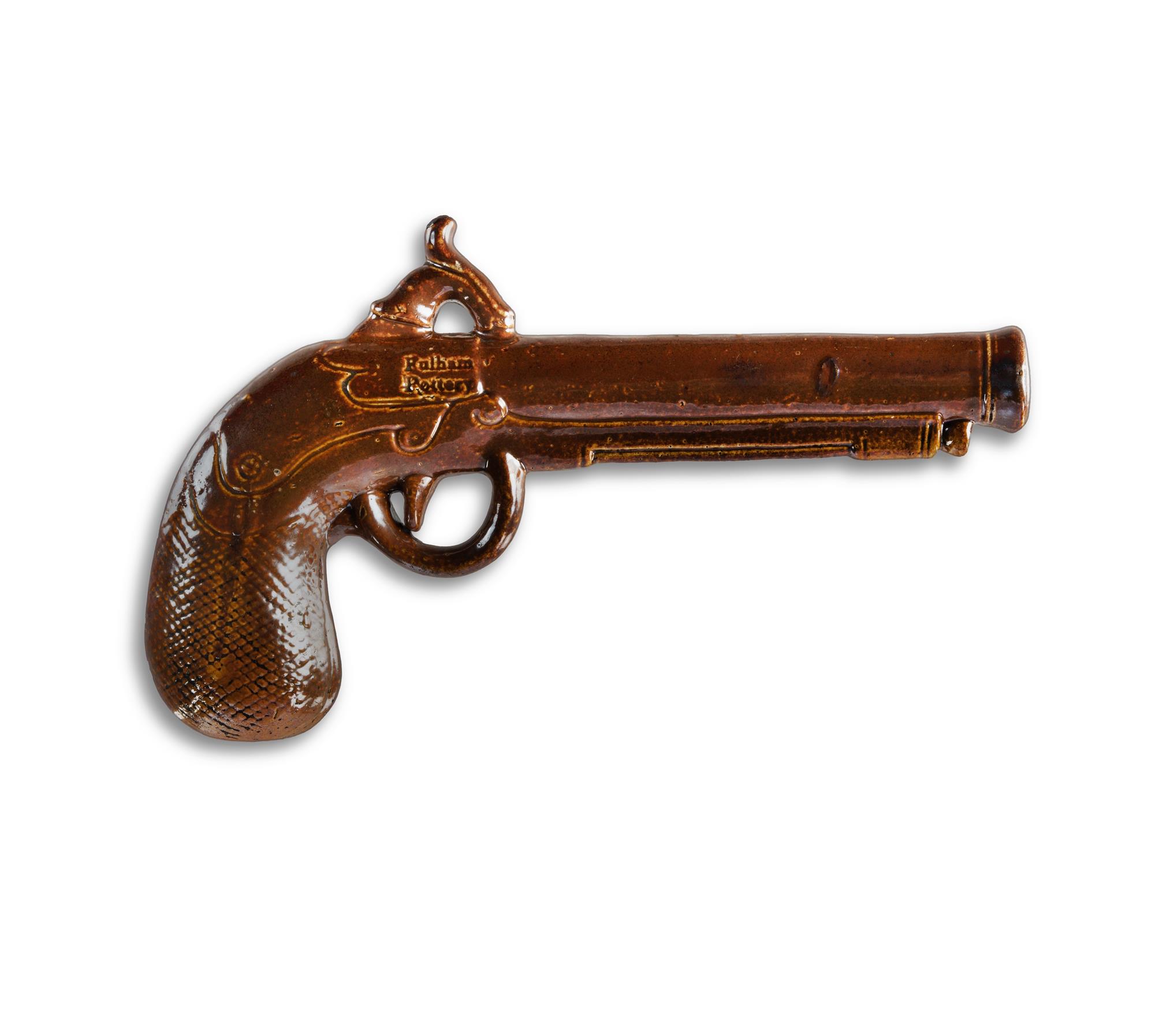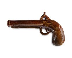 19th C Fulham Pottery Salt Glazed Flask Novelty whisky flask modelled as a percussion pistol. Impressed mark. (L22cm)Estimate $100-200