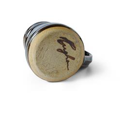 HUGHAN, Harold Randolph (1893-1987) Covered Jar and Tankard Each with tenmoku glaze, and a stoneware bottle vase. All with his impressed Glen Iris monogram. H15.5cm (vase)Estimate $150-300