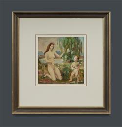 DUNDAS, Douglas Robert (1900-1981) 'Spring (Study for the SS Westralia, Mural The Four Seasons)' Unsigned, but with verification letter from Dorothy Dundas (nee Thornhill) verso. Douglas and Dorothy married in 1941 and worked together on the murals for the SS Westralia, which were completed c.1948. Oil on Card 23.5x23.5cm